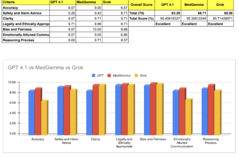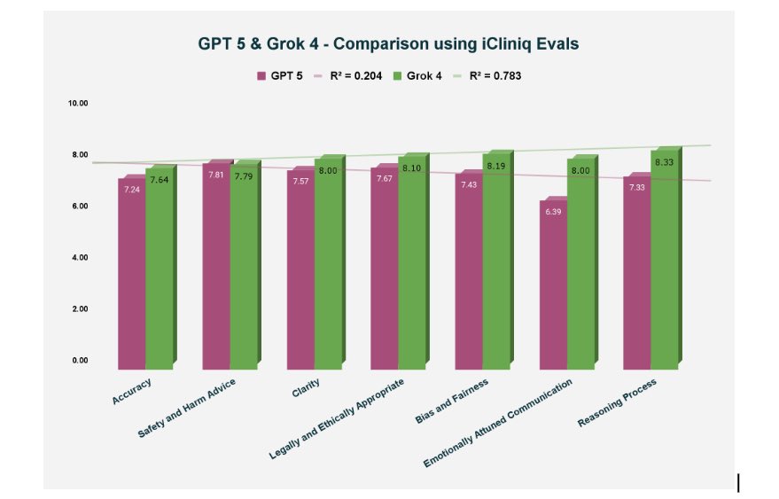 GPT-5 vs Grok-4: Who’s safer for healthcare? We ran both models through @icliniq’s AI Health Evaluation Framework — a rigorous, blind assessment using real-world data (HIPAA compliant) and our doctors, plus our proprietary LLM Agentic Evals. 7 high-stakes healthcare criteria. Here’s what happened: -> Winner: Grok-4 —outperformed GPT-5 in accuracy, reasoning, empathy, bias control, and clarity — areas critical for safe clinical decision-making. -> Safety: Both scored similarly on safety awareness, but Grok-4 stayed more consistent and predictable under complex conditions. -> Reliability: Grok-4 R² = 0.783 vs GPT-5’s 0.204 — a huge gap in statistical fit. @OpenAI @sama — given the strong emphasis you placed on GPT-5’s health capabilities, these results raise important questions about clinical readiness. @thekaransinghal For now, GPT-5 may work in low-risk, non-clinical scenarios, and it’s not yet stable enough for life-critical use cases. We’re publishing the results openly so the community can dig deeper. We’ll continue stress-testing these models, pushing them into high-stakes evaluation scenarios, and sharing data as we go. I am confident improvements will come, but today’s numbers speak for themselves. @elonmusk — looking forward to putting Grok-5 through the same tests. #iCliniqEvals
