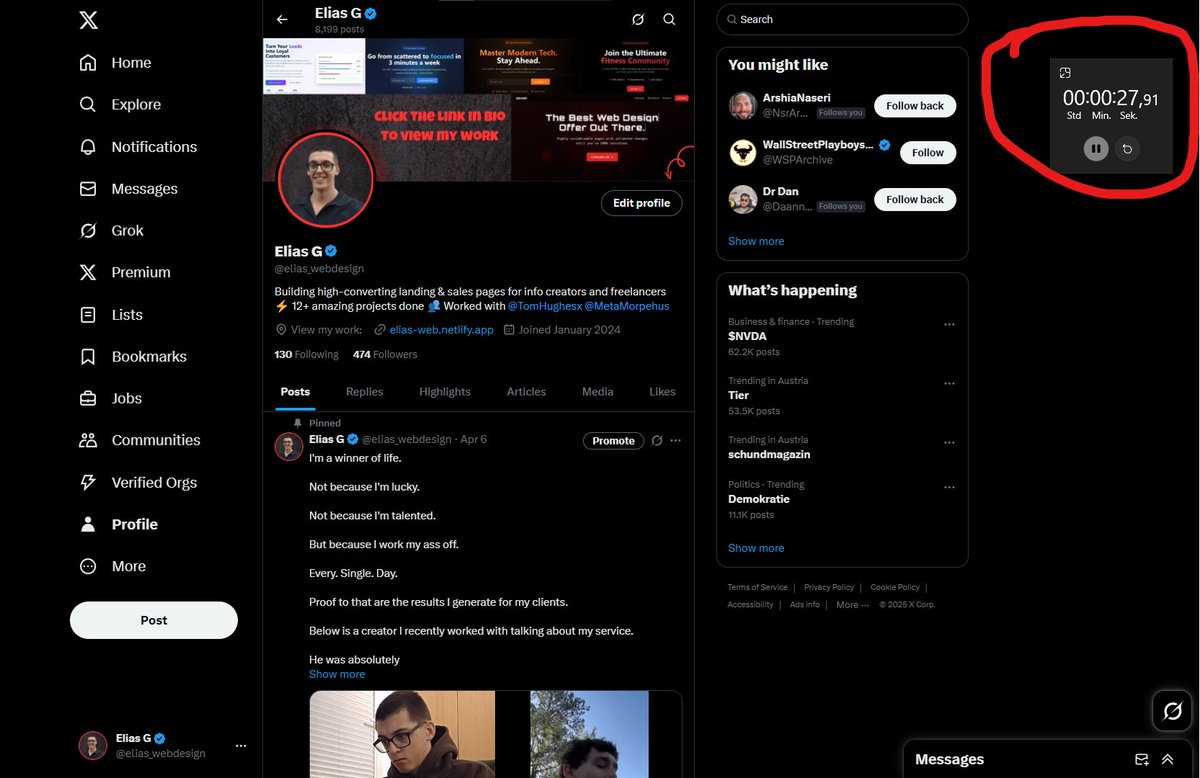 To grow his audience on X, Elias should balance his high-energy, results-driven content with occasional behind-the-scenes glimpses into his journey, including setbacks and wins, making his brand more relatable. Engaging more through Q&A threads or live sessions about conversion hacks would amplify follower interaction and showcase his expertise in real-time.