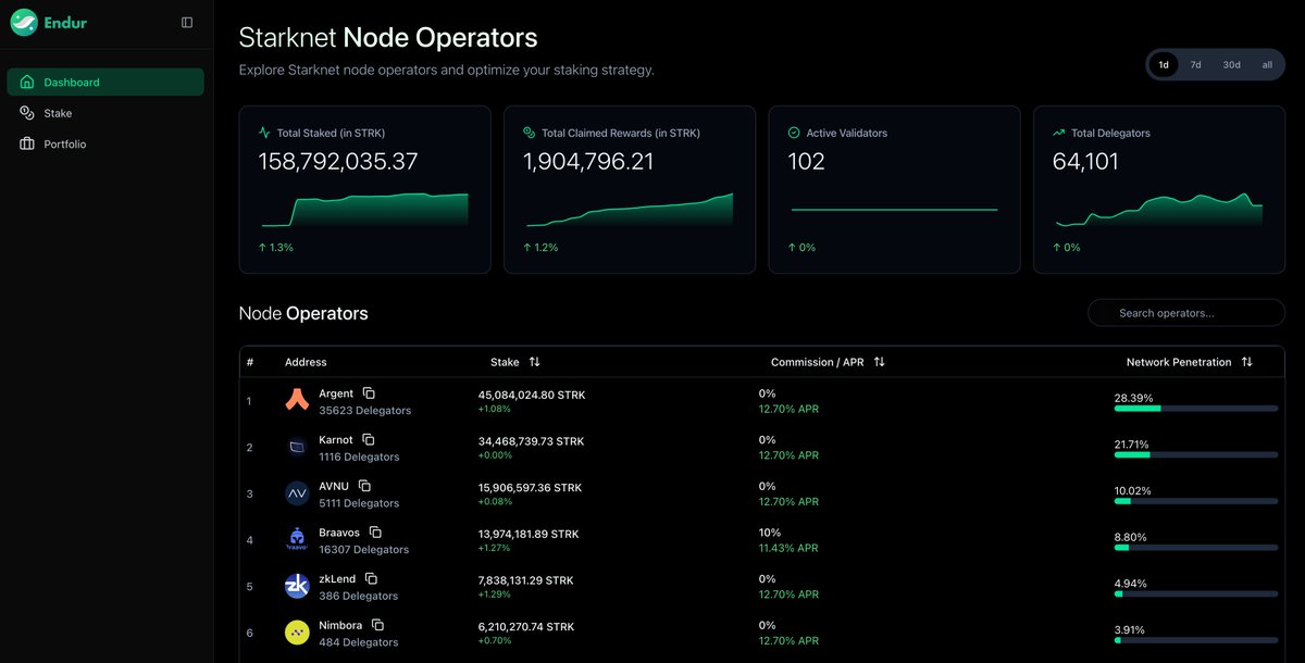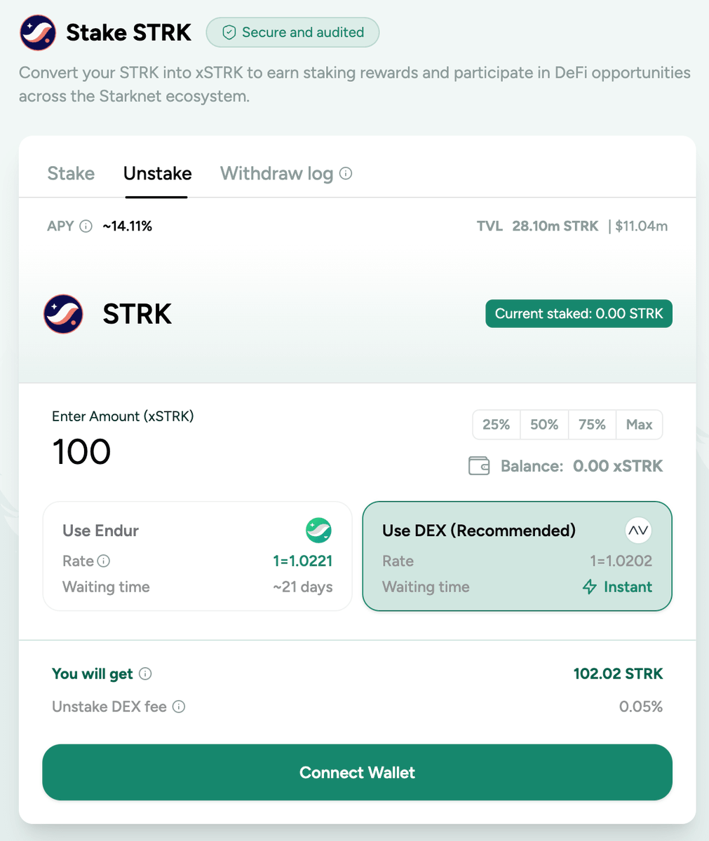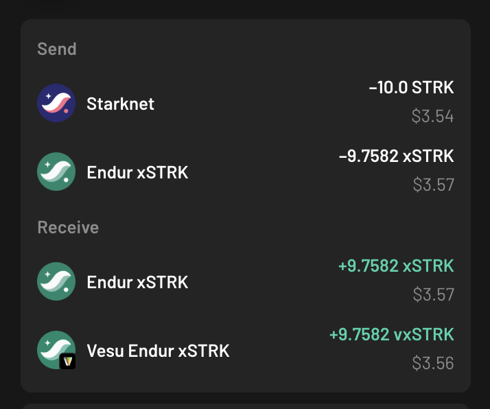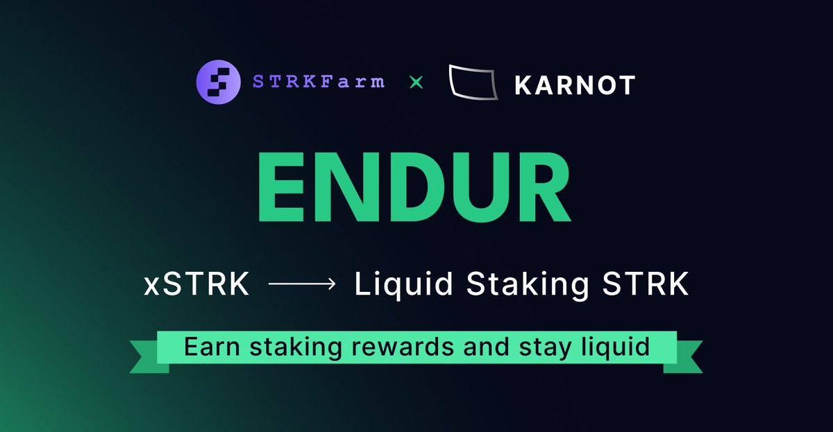 Endur lets you stake STRK on Starknet and receive xSTRK, earning staking rewards while keeping your tokens accessible. Built by @strkfarm × @karnotxyz.