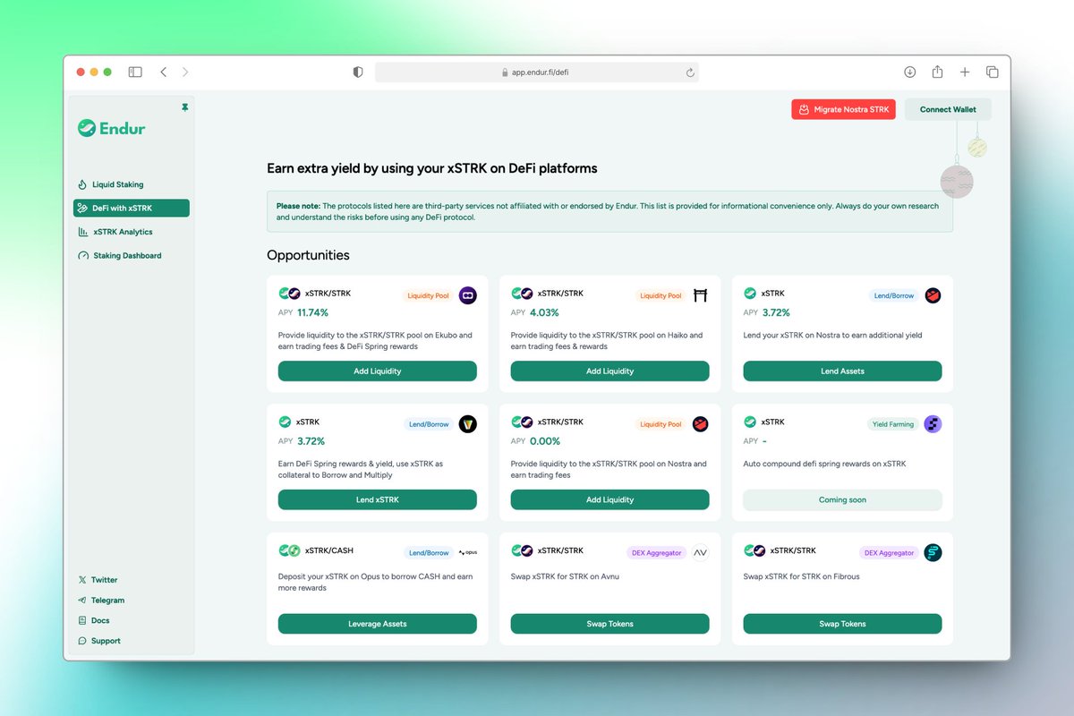 Endur.fi is the go-to hub for all things staking on Starknet, effortlessly linking users with innovative solutions like xSTRK. With a vibrant engagement style and an eye for collaboration, they're here to revolutionize liquidity and yield in the crypto universe. Get ready to join in on the excitement and ride the wave of decentralized finance!