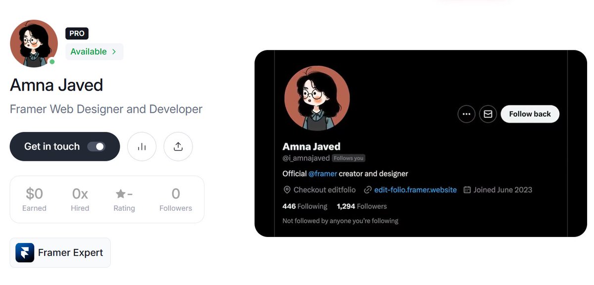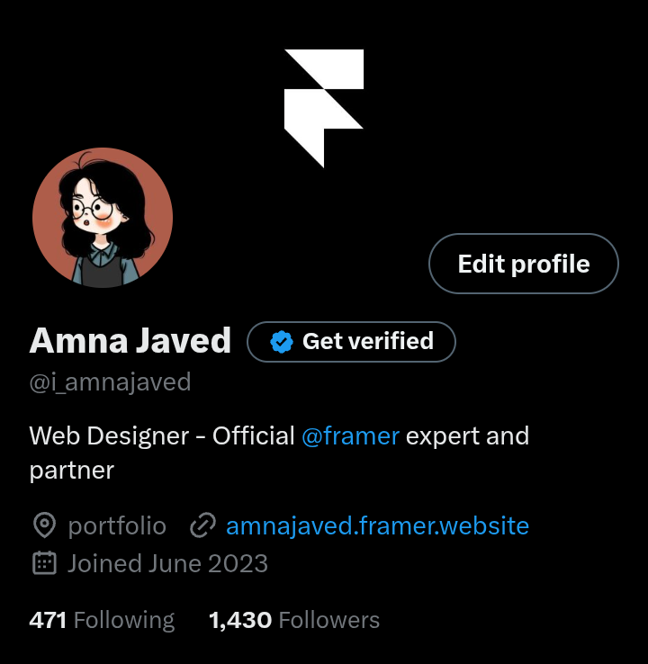 Amna Javed is a driven web designer who has carved out a niche as an official Framer expert and partner. She combines skill and ambition to build a strong professional presence, emphasizing fair treatment and respect in her work relationships. Her tweets celebrate milestones and share valuable lessons from her journey in the design world.