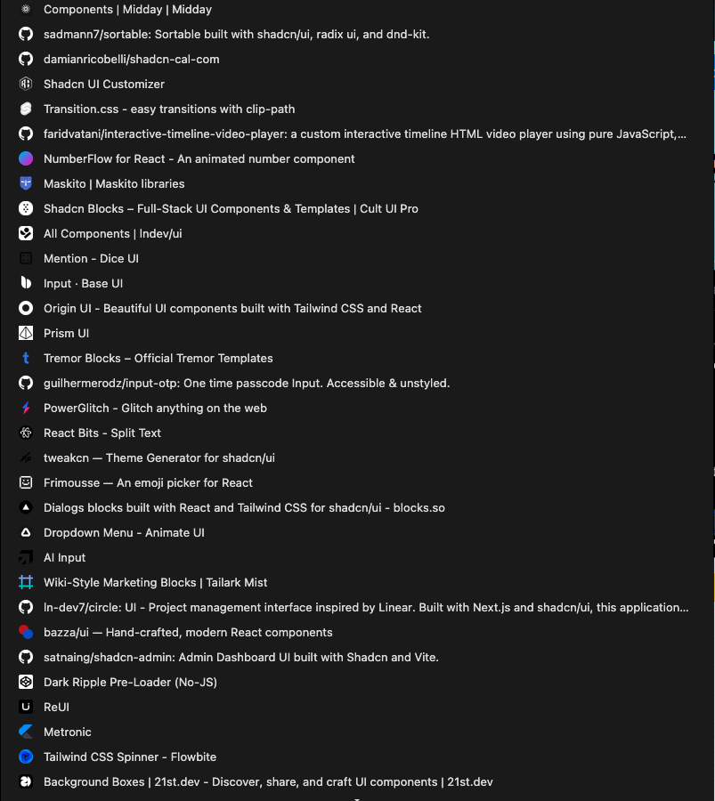 For a side project I was looking for the best UI Components Library and starters, this is the list after research my own and collect examples for a few months. What's works better in your case? IMO this is my top 5: 1. @shadcn /ui 2. @tremorlabs 3. React Bits by @davidhdev 4. Dice UI by @sadmann17 (composable components from shadcn/ui) 5. Prism UI by @Codehagen #BuildingInPublic