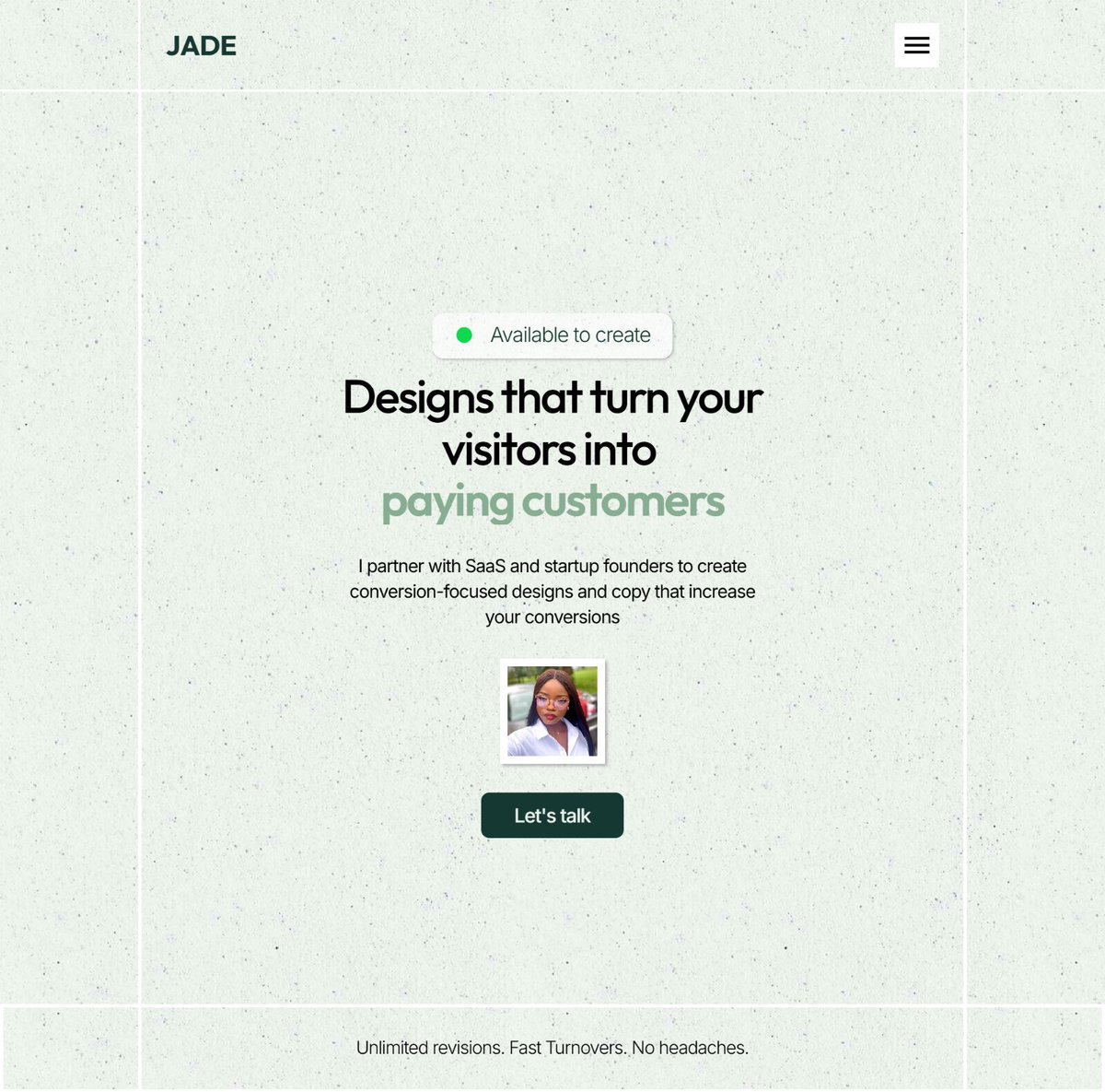 JADE Designs is a passionate web and product designer who specializes in clean, conversion-driven design combined with strategic copy. They deliver clear messages that cut through the noise and help startups and SaaS founders grow. Always showing up authentically, JADE balances creativity with practical impact.