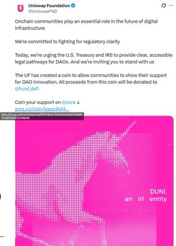 🚨 $DUNI was precisely captured by the AI coin selection system! Mastering #memecoins: The key to success lies in tools and information sources. This guy used GMGN's chain scanning function to capture a high-potential opportunity on the blockchain: $DUNI. From $584 -> $14.3K CA: 0xf41124e1c326e5044d0358d977ca02c0c5276649 Real-time K-line monitoring: GMGN platform: gmgn.ai/base/token/Mjh… OKX wallet view: web3.okx.com/zh-hans/token/… =xrDItaN&from_module=market_token&shareFrom=token_info&ref=YINGGE888 Chain Scanning Tool: gmgn.ai/?ref=MjhhuWaq Smart Wallet News Channel: t.me/fysq999 Wallet Address: gmgn.ai/base/address/M… 🔥Narrative Summary: The Uniswap Foundation launched a DAO-based governance token. DAOs (such as Uniswap Governance) lack legal protection in the United States, exposing participants to risks such as taxes and lawsuits. In August 2025, the Uniswap Foundation renamed Uniswap Governance to "DUNI," transforming it into a legitimate non-profit organization while retaining community decision-making power. All fee revenue generated by this token will be donated to the DeFi Education Fund. Background: - Uniswap Foundation - Official Launch - Led by Uniswap co-founder Devin Walsh - Supported by a16z partner Eddy Lazzarin - Signed by over 20 organizations, including the Uniswap Foundation and a16z Another Perspective: DUNI acts as a corporate entity for DEXs. Since DEXs cannot register as companies but still require management and compliance, the DUNI DAO organization was created to fulfill this corporate role. Despite all these explanations, the core essence remains gambling. Trading Bot: t.me/GMGN_base_bot?… Also available for trading using the OKX wallet: web3.okx.com/ul/joindex?ref… OKX Wallet Invitation Code: YINGGE888 (Permanent automatic 20% commission, tiered increase, up to 40%) Chain Scan Tutorial 👇