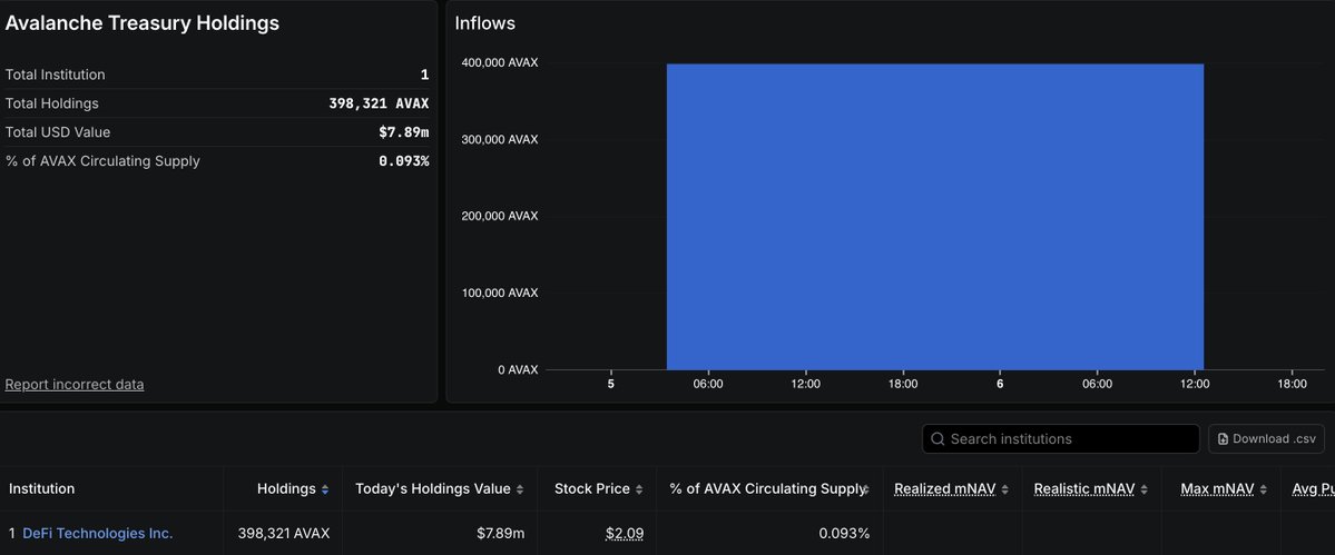 Digital Asset Treasuries have started to purchase @avax tokens! Digital Technologies, Inc is reported to be holding nearly 400K $AVAX worth $8M. This is just the beginning for Avalanche in the DAT world. Two AVAX exclusive treasuries, @avat_co and @avax_one, are together planned to stockpile north of $1B of AVAX in the near future 🔺