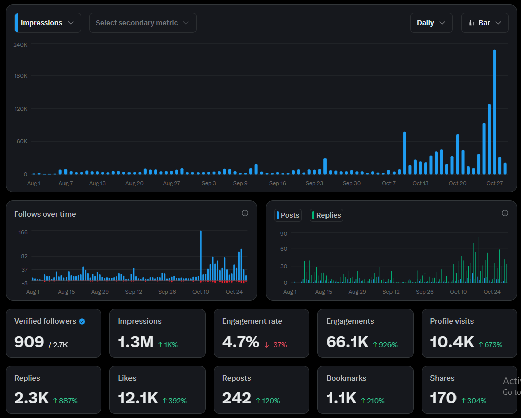 Achieving top engagement numbers on multiple tweets with tens of thousands of views and hundreds of likes, showcasing their natural ability to connect and entertain even complex communities like Polysights and tech fans.