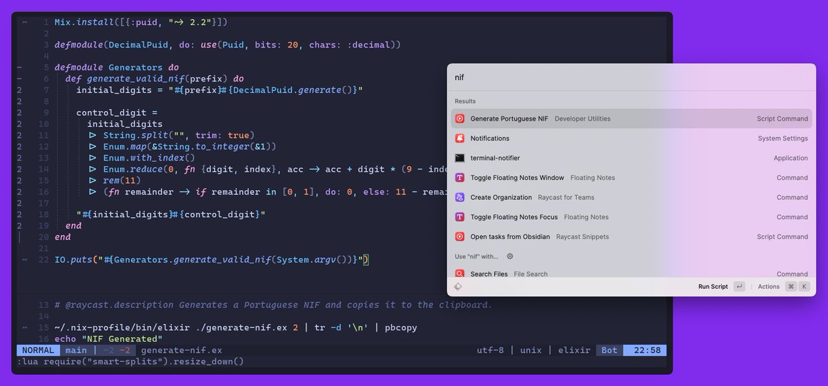 Paring @elixirlang with @raycastapp is a great way to improve the repetitive tasks during the day. NIF, IBAN, UUID, etc., are data I always need to generate while testing some features, so instead of copying from a site, I make one super fast.