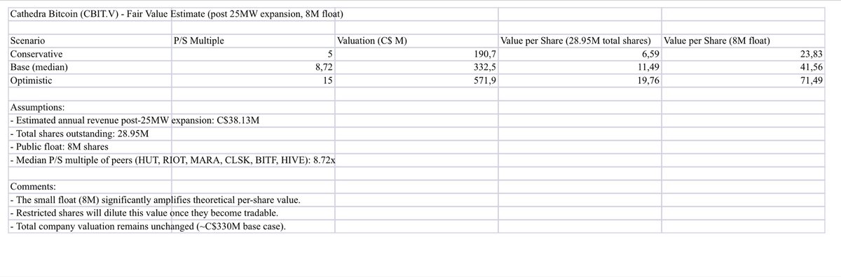 CATHEDRA BITCOIN CBIT 1.50$ Here is a detailed comparison with industry peers. With all shares (3/4 of which are not on the market) and just the float. The worst-case scenario puts the stock at nearly $7.00 and the most optimistic at over $71.00$ per share. $iren $mara $bitf $dmgi $riot $hut @mikealfred