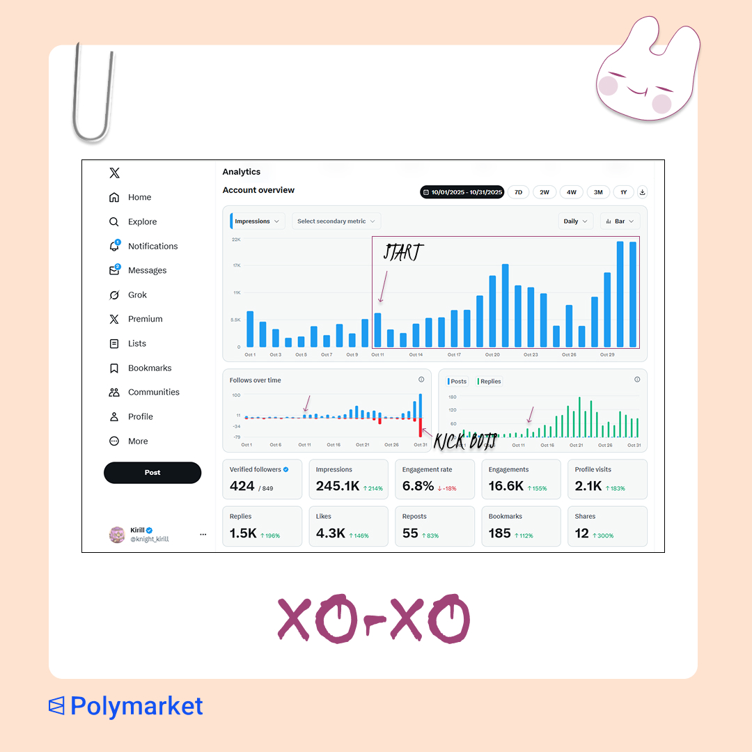{"data":{"__meta":{"device":false,"path":"/creators/knight_kirill"},"/creators/knight_kirill":{"data":{"user":{"id":"1483427019983622144","name":"Knight","description":"Alfa Hunter | Prediction Markets | Web3 Gaming | Researcher | Сontent Сreator | Bullish on @polymarket | @zscdao","followers_count":963,"friends_count":309,"statuses_count":8814,"profile_image_url_https":"https://pbs.twimg.com/profile_images/1977682102435844096/emXZL-Nr_normal.jpg","screen_name":"knight_kirill","location":"Alpha Caller","entities":{"description":{"urls":[]},"url":{"urls":[{"display_url":"polymarket.com/?via=knight","expanded_url":"https://polymarket.com?via=knight","url":"https://t.co/Fb9uF0Eqn2","indices":[0,23]}]}}},"details":{"type":"The Analyst","description":"Knight is a data-driven explorer in the world of prediction markets and Web3 gaming, blending deep research with real-time insights. As a content creator and researcher bullish on Polymarket, Knight deciphers complex market dynamics with a psychological edge. Known for detailed updates and challenge tracking, Knight turns numbers into actionable strategies that invite followers to think critically and engage actively.","purpose":"Knight’s life purpose is to demystify prediction markets and the collective human psychology behind trading, empowering others to make informed, strategic decisions. By fostering a community that values research, risk management, and emotional intelligence, Knight aims to elevate how people interact with emerging Web3 gaming and financial ecosystems.","beliefs":"Knight believes in the power of data combined with human behavior understanding; that the market is less about cold calculation and more about sentiment cycles and psychology. They uphold values of diligence (DYOR – Do Your Own Research), disciplined risk/reward management, transparency in sharing wins and losses, and continuous learning from both triumphs and wipeouts.","facts":"Fun fact: Knight measured the \"Time-to-Reaction\" speed of Polymarket compared to major news outlets, finding it beats traditional newsrooms like Reuters by up to tenfold in delivering market responses!","strength":"Knight’s greatest strength lies in combining rigorous quantitative analysis with behavioral psychology, giving them a unique edge in predicting market moves and educating followers on both strategy and emotional discipline.","weakness":"With 8,814 tweets and a high frequency of updates, Knight risks overwhelming followers with data-heavy content and might struggle to simplify complex ideas for casual audiences or maintain a balanced conversation pace.","recommendation":"To grow their audience on X, Knight should leverage more bite-sized educational threads, visually engaging infographics, and occasional personal anecdotes that humanize their market research. Engaging directly with followers by replying to comments with thoughtful insights and hosting regular themed Q&A sessions would also boost community loyalty and visibility.","roast":"Knight tweets so much analysis and data, I half expect them to plot their coffee consumption as a time-series and predict when their next caffeine crash will hit—because clearly, no emotion is safe when you’re running a marathon of cold-blooded composure.","win":"Knight’s standout achievement is turning a modest $50 investment on Polymarket into a whopping $15K, all while sharing the entire journey transparently and educating an engaged community on risk management and market psychology."},"tweets":[{"bookmarked":false,"display_text_range":[0,257],"entities":{"hashtags":[],"media":[{"display_url":"pic.x.com/UOfvWYcPUE","expanded_url":"https://x.com/knight_kirill/status/1984159998251855986/photo/1","id_str":"1984159048988495872","indices":[258,281],"media_key":"3_1984159048988495872","media_url_https":"https://pbs.twimg.com/media/G4kmJHzWEAABam7.png","type":"photo","url":"https://t.co/UOfvWYcPUE","ext_media_availability":{"status":"Available"},"features":{"all":{"tags":[{"user_id":"1261335549215989760","name":"Polymarket","screen_name":"Polymarket","type":"user"},{"user_id":"1965783030062022656","name":"Polymarket Traders","screen_name":"PolymarketTrade","type":"user"}]},"large":{"faces":[]},"medium":{"faces":[]},"small":{"faces":[]},"orig":{"faces":[]}},"sizes":{"large":{"h":387,"w":499,"resize":"fit"},"medium":{"h":387,"w":499,"resize":"fit"},"small":{"h":387,"w":499,"resize":"fit"},"thumb":{"h":150,"w":150,"resize":"crop"}},"original_info":{"height":387,"width":499,"focus_rects":[{"x":0,"y":73,"w":499,"h":279},{"x":56,"y":0,"w":387,"h":387},{"x":80,"y":0,"w":339,"h":387},{"x":152,"y":0,"w":194,"h":387},{"x":0,"y":0,"w":499,"h":387}]},"allow_download_status":{"allow_download":true},"media_results":{"result":{"media_key":"3_1984159048988495872"}}}],"symbols":[],"timestamps":[],"urls":[],"user_mentions":[]},"extended_entities":{"media":[{"display_url":"pic.x.com/UOfvWYcPUE","expanded_url":"https://x.com/knight_kirill/status/1984159998251855986/photo/1","id_str":"1984159048988495872","indices":[258,281],"media_key":"3_1984159048988495872","media_url_https":"https://pbs.twimg.com/media/G4kmJHzWEAABam7.png","type":"photo","url":"https://t.co/UOfvWYcPUE","ext_media_availability":{"status":"Available"},"features":{"all":{"tags":[{"user_id":"1261335549215989760","name":"Polymarket","screen_name":"Polymarket","type":"user"},{"user_id":"1965783030062022656","name":"Polymarket Traders","screen_name":"PolymarketTrade","type":"user"}]},"large":{"faces":[]},"medium":{"faces":[]},"small":{"faces":[]},"orig":{"faces":[]}},"sizes":{"large":{"h":387,"w":499,"resize":"fit"},"medium":{"h":387,"w":499,"resize":"fit"},"small":{"h":387,"w":499,"resize":"fit"},"thumb":{"h":150,"w":150,"resize":"crop"}},"original_info":{"height":387,"width":499,"focus_rects":[{"x":0,"y":73,"w":499,"h":279},{"x":56,"y":0,"w":387,"h":387},{"x":80,"y":0,"w":339,"h":387},{"x":152,"y":0,"w":194,"h":387},{"x":0,"y":0,"w":499,"h":387}]},"allow_download_status":{"allow_downl