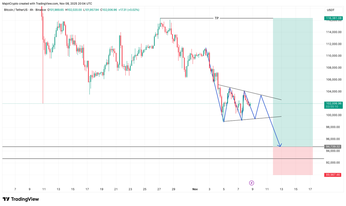 $BTC forming a Bearish Pennant? Myriad has the market for the resolution. My chart analysis suggests a classic continuation pattern after a significant drop. The technical projection points down, but a major bullish surprise is always on the table. I'm putting my conviction on the Myriad Market (@MyriadMarkets): "Bitcoin’s next move: Pump to $115K or Dump to $85K?" My Pick: Pump to $115K. Betting on the technical pattern failing in this high-liquidity environment. What's your Flex PnL telling you? @MyriadMarkets