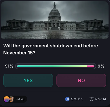The Government is in Gridlock. The Prediction Market is NOT. (91.4% Signal) The chaos in Washington is real, but the @MyriadMarkets market on "Will the government shutdown end before November 15?" shows the power of aggregated conviction: 91.4% YES. This isn't political polling it's InfoFi in action: 1/3 Filtering the Noise: While politicians are trading soundbites and drama, traders are pricing in the legislative process and economic pressure (like the impending disruption to travel and the Thanksgiving holiday). The market cuts through the media noise to reflect the actuality of the closing deal. 2/3 The High-Conviction Bet: A 91.4% probability means the market believes the legislative mechanisms required to end the longest-ever shutdown are already in motion, despite the procedural delay. Betting against that strong consensus is a high-risk gamble. 3/3 The Meta-Signal: This market demonstrates that Myriad Markets is the ultimate truth layer for both political and financial risk. It's quantifying the probability of events that directly impact global markets (e.g., liquidity returning, as mentioned in the search data). The odds are clear: Collective Intelligence believes the end is imminent. Are you trading the political drama or the market data?