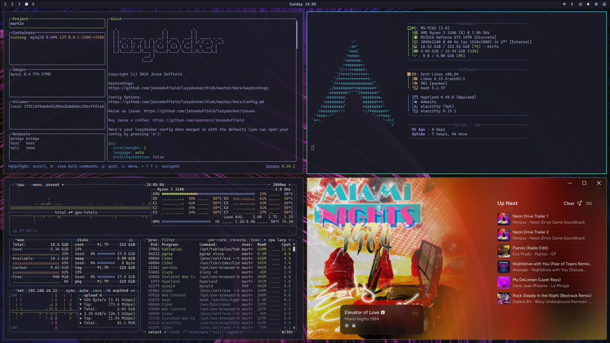 Thank you @dhh for Omarchy. I've tried to setup Arch and Hyprland for a while and it felt too overwhelming to start from scratch. This just worked out of the box (minus a simple nvidia fix) and I can finally start to tinker with it. I feel like I own my hardware again <3.