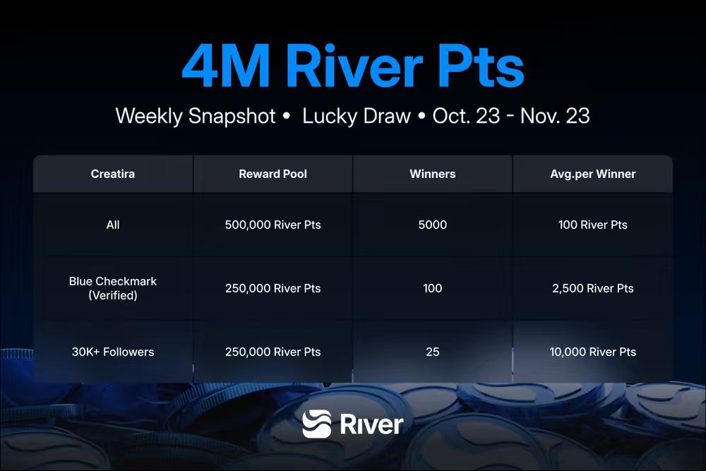 📢Thời gian snapshot để quay thưởng hàng tuần là ngẫu nhiên, y như thầy cô bất ngờ gọi lên bảng trả bài vậy. Lúc đó mà tên ai không có chữ RIVER là bị loại thẳng tay, khóc một dòng sông luôn.