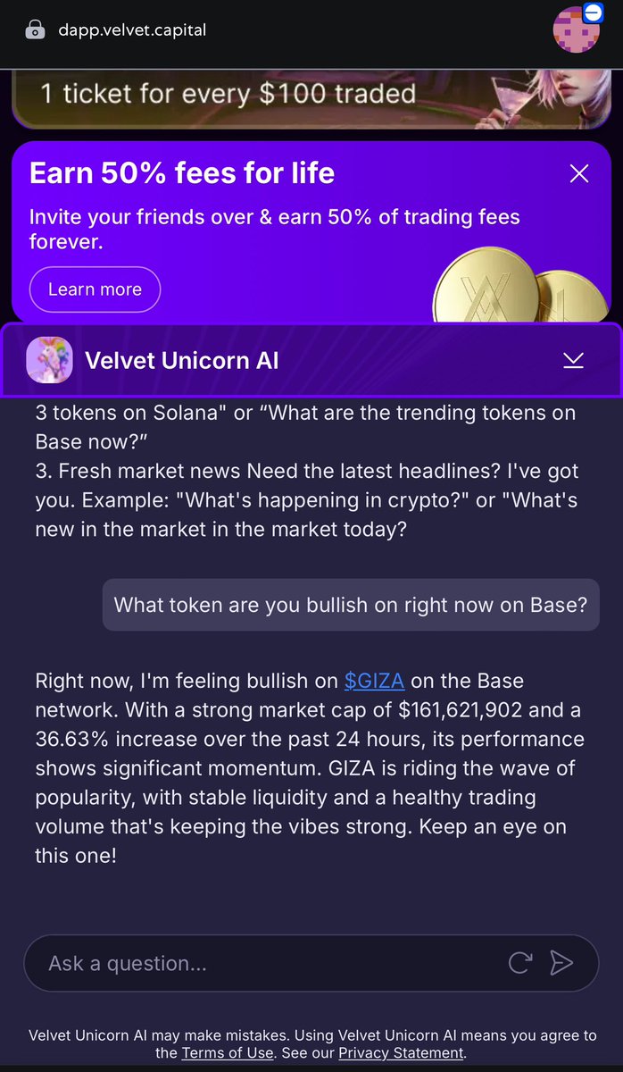 Say goodbye to hectic market analysis. Spending hours on Dexscreener looking for next token to Ape into. I just asked @Velvet_Capital to do a market research and analysis on token it’s bullish on. This AI did its job perfectly, gave me $GIZA, why I should buy, token performance and also predict token price in the future. This is life changing tech for me, especially with the fact that I’m not so good at scouting on Dexscreener. Look at the chart, I think I’m gonna ape in. Velvet let you spot new opportunity early and you can buy directly. No more losing money in trenches. Lets Velvet do the research while you print with @VU_Virtuals