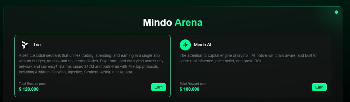 just launched Mindo Arena a Web3 battleground where attention, influence & engagement become real, measurable value on chain. 🏆 Total rewards: $220,000+ 💡 Projects spotlighted: • @useTria : Self custodial neobank, no bridges, no gas • Mindo AI : AI engine turning attention → capital Gamified. Transparent. Rewarding. Join early, climb the leaderboard, and earn from your influence ⚡️ 👉 mindoshare.ai/kol?ref=cmh28n… #AI #Web3 #DeFi #AttentionEconomy #MindoArena