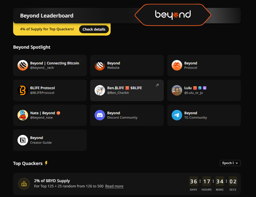 GM Day 1 ☀️ @beyond__tech Quackers are live 📘 Creator Guide: Need help getting started? We got you. 👉 Beyond’s Wallchain Creator Guide t.co/v46wmzpCL9 🔹 Epoch 1 details 🎯 Rewards: 4% of total supply 🧠 Top 125 mindshare contributors 🎲 +25 random from ranks 126–500 💎 Unlock: Full unlock, no cliff, no vesting ⏳ Ends: Dec 8 → 2% of $BYD supply distributed Join the TG chat and start quacking with the crew 🐥 The mindshare game begins stay active, stay Beyond @wallchain