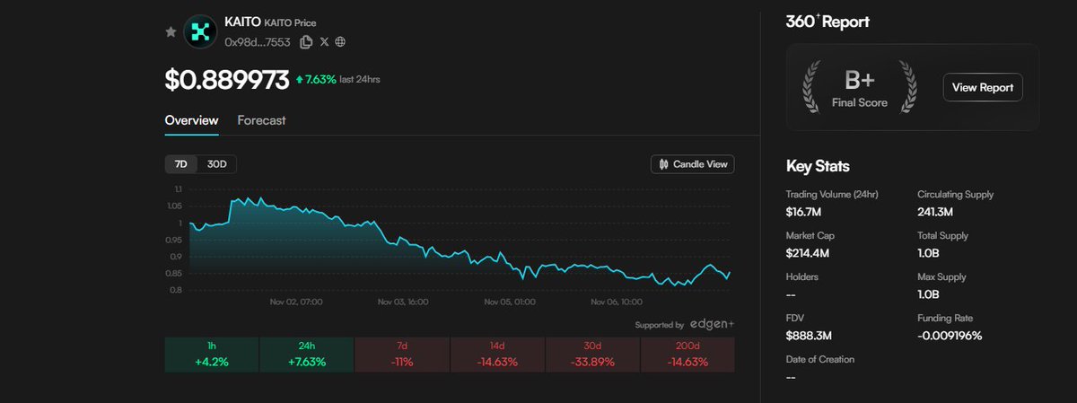 KAITO ($KAITO) Market Update — November 7, 2025 @KaitoAI the AI powered data intelligence protocol continues to strengthen its position as one of the leading projects combining artificial intelligence and blockchain analytics. By integrating machine learning with decentralized data verification, KAITO is shaping the future of on-chain research and predictive market insights As of 10:30 PM (Vietnam time), KAITO is trading around $0.8899, up +7.63% in the past 24 hours. The token’s 24h trading volume has reached $16.7 million, while its market capitalization stands at $214.4 million. Despite being down approximately 33.9% over the last 30 days, the recent uptick suggests a potential short term reversal as buyers return to the market. According to the latest 360° Report, KAITO holds a B+ rating, reflecting solid fundamentals and steady ecosystem growth. On the technical side, the price is currently testing resistance near $0.89–$0.91, with a breakout possibly pushing the next target toward $1.02. Meanwhile, strong support sits between $0.80–$0.83, a critical zone for sustaining current momentum. Overall sentiment remains cautiously optimistic. The AI + crypto narrative continues to gain attention, and if KAITO maintains trading volume and on-chain activity, it could be among the key performers heading into late Q4 2025. Stay tuned with @EdgenTech for live insights and data updates and remember : every AI trend comes with volatility, so trade wisely and stay informed. $KAITO #AI #DATA #CryptoMarket #EdgenTech @wallchain