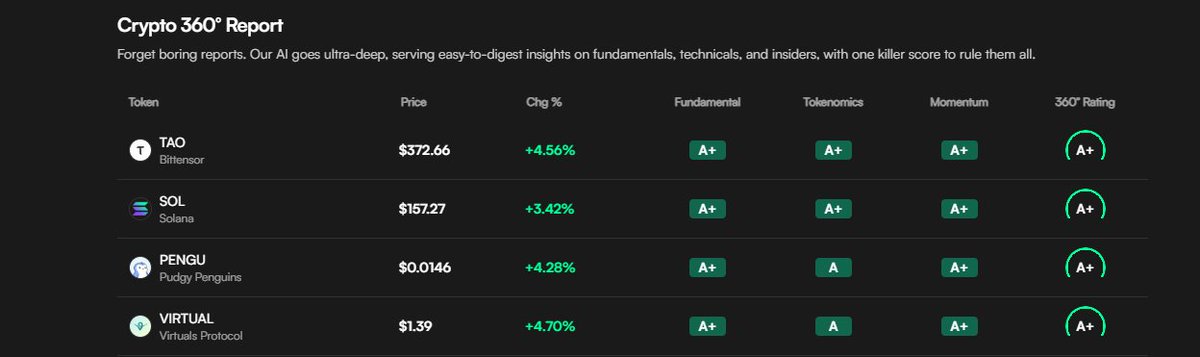 🧩 @EdgenTech 360° Report - My Take on Today’s Market Momentum There’s something different about this phase of the market. The noise is still there, but underneath, you can feel real alignment forming between fundamentals, builder activity, and market conviction. When I look at this week’s 360° scores, a pattern stands out, every top performer isn’t just riding hype they’re executing. 🧠 $TAO (Bittensor) The Silent AI Powerhouse $372.66 | +4.56% | Rating: A+ Bittensor feels less like a token and more like a living network of intelligence. Its ecosystem is maturing fast with developers treating it as the open layer for decentralized AI compute. The fundamentals here are deep: organic adoption, economic sustainability, and a narrative that keeps getting stronger the more AI goes mainstream. TAO isn’t chasing attention, it’s earning credibility. ⚡ $SOL (Solana) Efficiency Meets Conviction $157.27 | +3.42% | Rating: A+ Solana’s resurgence isn’t luck, it’s discipline. While others overcomplicate scaling, Solana just delivers. Transaction speed, developer activity, and user experience are converging into something that feels inevitable. What I like most is how Solana has evolved from “the ETH alternative” into its own economic zone clean, fast, and alive with builders. 🐧 $PENGU (Pudgy Penguins) The Power of Emotional Capital $0.0146 | +4.28% | Rating: A+ This one always fascinates me. Pudgy Penguins has become more than an NFT brand it’s a cultural anchor for the next generation of Web3 IP. The team understood something fundamental: value travels through emotion. The Edgen 360° score reflects that balance, strong fundamentals, healthy tokenomics, and momentum that’s genuinely community driven. When culture meets clarity, you get assets like PENGU. 🌐 $VIRTUAL (Virtuals Protocol) Building the AI Identity Layer $1.39 | +4.70% | Rating: A+ Virtuals Protocol feels like one of those projects building quietly but purposefully. It’s where AI agents meet self sovereign identity and that’s a direction I’m paying serious attention to. The fundamentals are strong, and the partnerships forming around this ecosystem suggest it could become a core layer for on chain AI coordination in the coming years. 📈 My Broader Take on the Market Right Now There’s a clear narrative rotation happening. We’re moving from short term speculation to structural conviction. → AI tokens are leading this charge, not just as a trend, but as infrastructure for the next data economy. → Layer 1s like Solana are proving that performance and UX still matter more than buzzwords. → Community driven ecosystems (like PENGU) are showing that emotion and culture are actual forms of utility. Momentum feels healthy not euphoric. And that’s exactly where long term opportunity lives. 🪞 Final Reflection The edgen 360° framework doesn’t just measure performance, it reveals coherence. And right now, TAO, SOL, PENGU, and VIRTUAL all share one rare trait, they’re aligned across fundamentals, token design, and real user demand. That alignment is where conviction begins and where the next wave of sustainable growth is already taking shape. @KaitoAI #Web3Growth #CryptoInsights #BlockchainInnovation #CryptoResearch #DeFi