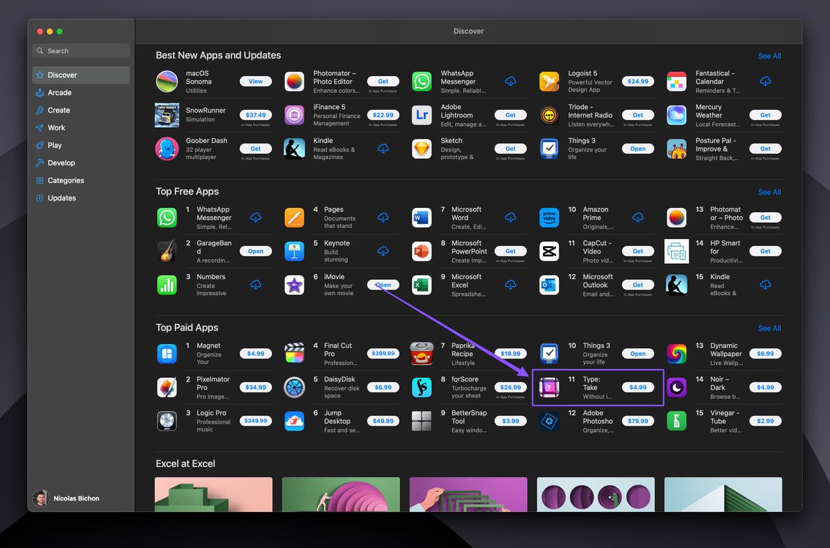 Fun fact: Nicolas's app made it to the top charts in the US Mac App Store, sandwiched between major brands like Things and Photoshop, showcasing his unexpected but significant impact in the tech industry.