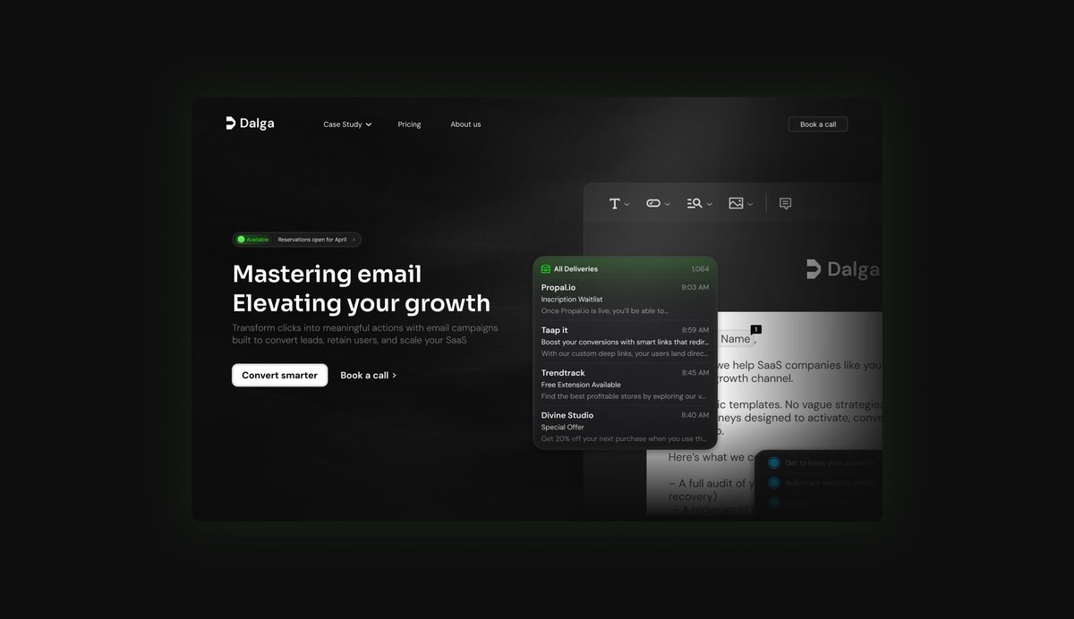 1 Jour : 1 Design Neuvième jour du challenge personnel. Aujourd’hui, j’ai travaillé sur une hero section pour la landing page d’une agence spécialisée dans l’emailing : @The_Dalga de @ekrem_hr L’objectif était de poser une accroche forte, claire, tout en gardant une vibe pro mais dynamique. Jour 9
