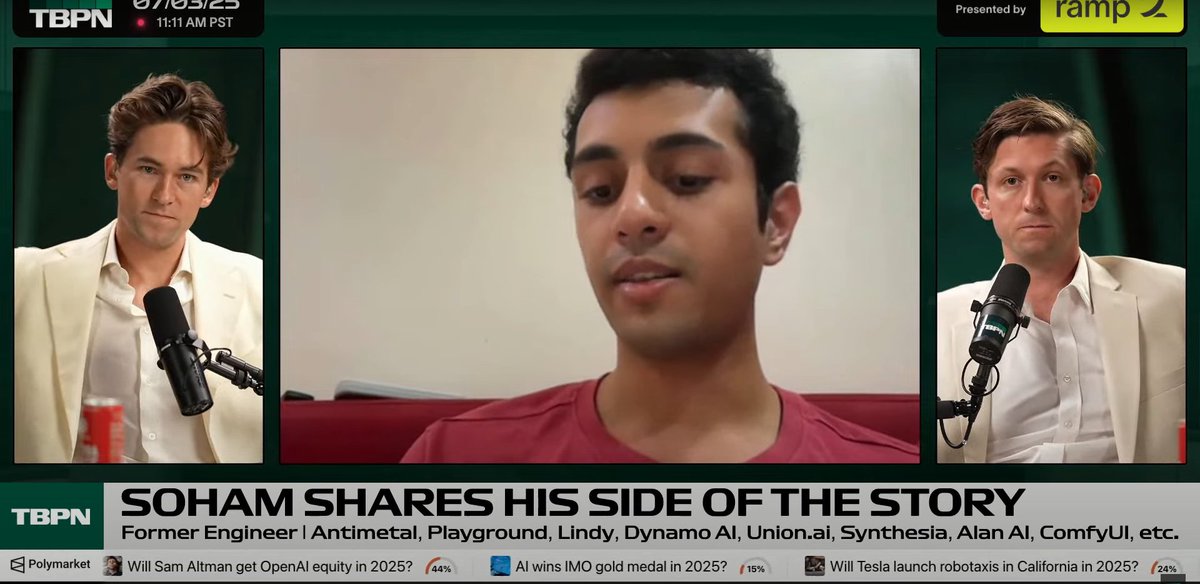 I don't buy the Soham's story on @tbpn. It's all crap! On the contrary, I kinda liked how he hacked his way out of companies. a) If you worked for any of these company the way he said he's dedicated. They would be very rewarding. A lot of startups pay handsome money especially YC companies. b) I'm ok with someone working in my company citing they're available partime. But they deliver. @Suhail would actual be fine with it. It's the incompetency that got him fired. So upskill maybe? c) It's ok to fuck up. It happened so publicly. So take the L. At one point says he had economic needs and later says he doesn't need the money(and doing it for fun). He's lying about this. @tbpn honestly asked really shit questions. Should have called out on his BS. But whatever he did, I think he has an answer for the YC question: Tell us about the time you broke a non-technical system and used it to your advantage.