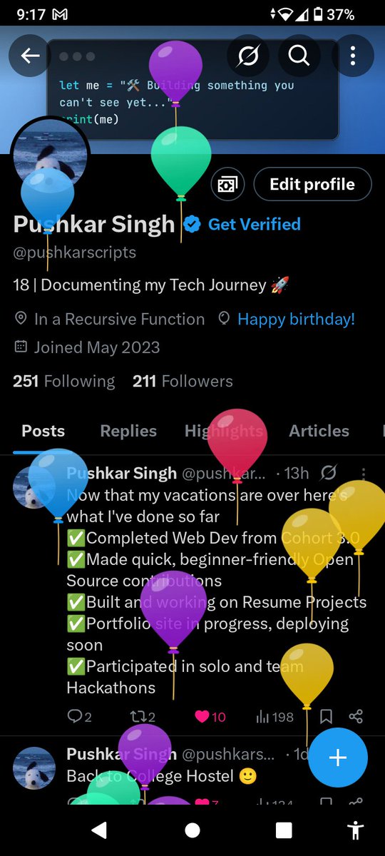 Pushkar celebrated reaching 600 followers on Diwali, marking a meaningful milestone that reflects their engagement and steady progress. They also won 2nd prize in a Python competition during their 3rd semester and regularly produce content like articles and project demos.