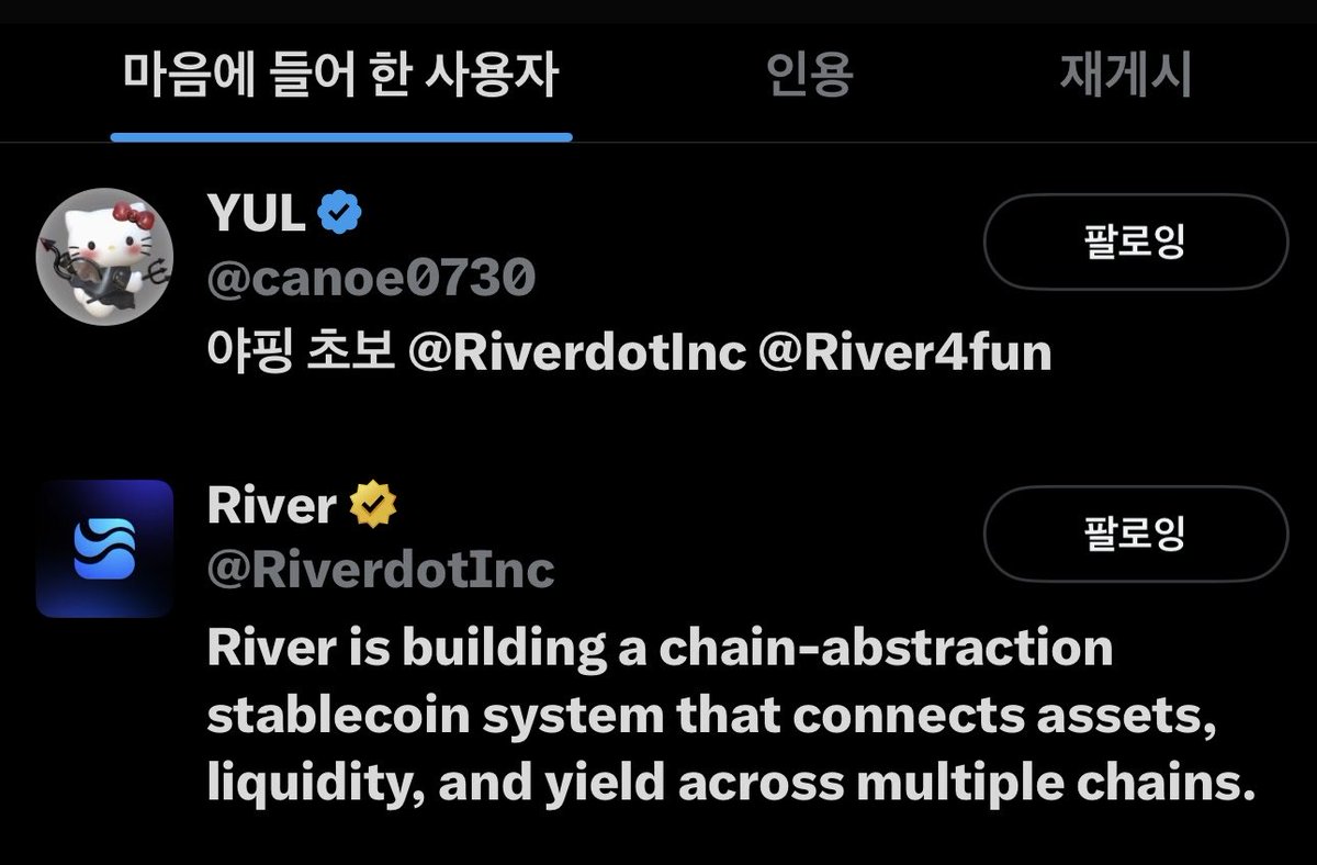 ํด๋ณผ๊ฒ์!๐ฅ๐ฅ\n๊ทธ๋ฆฌ๊ณ ์ ์๊ฒ ๋ง์ ๊ฐ๋ฅด์นจ์ ์ฃผ์๋ @cjh21047 ํธ์ฌ์กฐ๋์ ๋ค์ค์ผํ์ ๋์ ํด๋ณด๋ คํฉ๋๋ค. ์ ๊ฐ์ ์ํ ๊ณ์ ๋ ํจ๊ณผ๊ฐ ์์ ์ง ๊ถ๊ธํ๋ค์.\n\n์ฌ๋ฌ ๋ธ๋ก ์ฒด์ธ์์ ์ฝ์ธ ์ ๋ฌผ๊ฑฐ๋๋ฅผ ์ฝ๊ฒ ํ ์ ์๋@vooi_io ์ ๋์ ํฉ๋๋ฏ! \n๋ฟ์ด, ๋ฆฌ๋ฒ์ฒ๋ผ ๋ด๊ฒ ํ๋ฌ ๋ค์ด์์ค~~\nchain-Abstraction, Gasless, \nPerps+RWAs, AI-driven Infrastructure","in_reply_to_user_id_str":null,"in_reply_to_status_id_str":null,"is_quote_status":1,"is_ai":null,"ai_score":null},{"bookmarked":false,"display_text_range":[38,94],"entities":{"hashtags":[],"symbols":[],"timestamps":[],"urls":[],"user_mentions":[{"id_str":"1470797542925680644","name":"BlackDiary | Axelar Korea ARC","screen_name":"blackdiarytv","indices":[0,13]},{"id_str":"1749307986449985536","name":"River","screen_name":"RiverdotInc","indices":[14,26]},{"id_str":"1894023907386216448","name":"River4FUN ๐","screen_name":"River4fun","indices":[27,37]}]},"favorited":false,"in_reply_to_screen_name":"blackdiarytv","lang":"ko","retweeted":false,"fact_check":null,"id":"1979008376446108090","view_count":14,"bookmark_count":0,"created_at":1760667339000,"favorite_count":1,"quote_count":0,"reply_count":1,"retweet_count":0,"user_id_str":"1951059618769281024","conversation_id_str":"1978990595189416187","full_text":"@blackdiarytv @RiverdotInc @River4fun ์ ์ฑ์ค๋ฐ ๋๊ธ์ ์ ์์ ๊ณต๊ฐํ๊ณ ๊ฐ๋๋ค. ์ ๊ฐ ๊ฐ๋ณ๊ฒ ์ ์์๋์ ์ ์ฑ์ค๋ ์ ์์ ๋ ์ฐจ์ด๊ฐ ์ปธ์ต๋๋ค","in_reply_to_user_id_str":"1470797542925680644","in_reply_to_status_id_str":"1978990595189416187","is_quote_status":0,"is_ai":null,"ai_score":null},{"bookmarked":false,"display_text_range":[34,83],"entities":{"hashtags":[],"symbols":[],"timestamps":[],"urls":[],"user_mentions":[{"id_str":"1771507195357831168","name":"godhee โ๏ธโ๏ธT","screen_name":"godhee__","indices":[0,9]},{"id_str":"1894023907386216448","name":"River4FUN ๐","screen_name":"River4fun","indices":[10,20]},{"id_str":"1749307986449985536","name":"River","screen_name":"RiverdotInc","indices":[21,33]}]},"favorited":false,"in_reply_to_screen_name":"godhee__","lang":"ko","retweeted":false,"fact_check":null,"id":"1979111753918407124","view_count":4,"bookmark_count":0,"created_at":1760691986000,"favorite_count":0,"quote_count":0,"reply_count":0,"retweet_count":0,"user_id_str":"1951059618769281024","conversation_id_str":"1979086752859234391","full_text":"@godhee__ @River4fun @RiverdotInc ์ ์ ์ด๋ง์ด๋งํ ํฌ์ธํธ๋ ์ด๋ป๊ฒ ๋ฐ๋ ๊ฑด๊ฐ์? ๋ฆฌ๋ฒ ๊ณต๊ณ์ ๋ฐฉ๋ฌธ๋ณด๋ค ํจ์ฌ ํ์๊ฐ ์๋ค์","in_reply_to_user_id_str":"1771507195357831168","in_reply_to_status_id_str":"1979086752859234391","is_quote_status":0,"is_ai":null,"ai_score":null}]},{"label":"2025-10-19","value":1,"startTime":1760745600000,"endTime":1760832000000,"tweets":[{"bookmarked":false,"display_text_range":[0,184],"entities":{"hashtags":[],"media":[{"display_url":"pic.x.com/5Bp0LB3rpR","expanded_url":"https://x.com/sameasme9955542/status/1979610754895733021/photo/1","id_str":"1979610747144458240","indices":[185,208],"media_key":"3_1979610747144458240","media_url_https":"https://pbs.twimg.com/media/G3j9fHEXUAAgfNz.jpg","type":"photo","url":"https://t.co/5Bp0LB3rpR","ext_media_availability":{"status":"Available"},"features":{"large":{"faces":[]},"medium":{"faces":[]},"small":{"faces":[]},"orig":{"faces":[]}},"sizes":{"large":{"h":445,"w":762,"resize":"fit"},"medium":{"h":445,"w":762,"resize":"fit"},"small":{"h":397,"w":680,"resize":"fit"},"thumb":{"h":150,"w":150,"resize":"crop"}},"original_info":{"height":445,"width":762,"focus_rects":[{"x":0,"y":18,"w":762,"h":427},{"x":159,"y":0,"w":445,"h":445},{"x":186,"y":0,"w":390,"h":445},{"x":270,"y":0,"w":223,"h":445},{"x":0,"y":0,"w":762,"h":445}]},"media_results":{"result":{"media_key":"3_1979610747144458240"}}},{"display_url":"pic.x.com/5Bp0LB3rpR","expanded_url":"https://x.com/sameasme9955542/status/1979610754895733021/photo/1","id_str":"1979610747152797696","indices":[185,208],"media_key":"3_1979610747152797696","media_url_https":"https://pbs.twimg.com/media/G3j9fHGWkAAjRcr.jpg","type":"photo","url":"https://t.co/5Bp0LB3rpR","ext_media_availability":{"status":"Available"},"features":{"large":{"faces":[]},"medium":{"faces":[]},"small":{"faces":[]},"orig":{"faces":[]}},"sizes":{"large":{"h":1720,"w":1720,"resize":"fit"},"medium":{"h":1200,"w":1200,"resize":"fit"},"small":{"h":680,"w":680,"resize":"fit"},"thumb":{"h":150,"w":150,"resize":"crop"}},"original_info":{"height":1720,"width":1720,"focus_rects":[{"x":0,"y":508,"w":1720,"h":963},{"x":0,"y":0,"w":1720,"h":1720},{"x":0,"y":0,"w":1509,"h":1720},{"x":0,"y":0,"w":860,"h":1720},{"x":0,"y":0,"w":1720,"h":1720}]},"media_results":{"result":{"media_key":"3_1979610747152797696"}}},{"display_url":"pic.x.com/5Bp0LB3rpR","expanded_url":"https://x.com/sameasme9955542/status/1979610754895733021/photo/1","id_str":"1979610747136020480","indices":[185,208],"media_key":"3_1979610747136020480","media_url_https":"https://pbs.twimg.com/media/G3j9fHCWkAAjAC3.jpg","type":"photo","url":"https://t.co/5Bp0LB3rpR","ext_media_availability":{"status":"Available"},"features":{"large":{"faces":[]},"medium":{"faces":[]},"small":{"faces":[]},"orig":{"faces":[]}},"sizes":{"large":{"h":1720,"w":1720,"resize":"fit"},"medium":{"h":1200,"w":1200,"resize":"fit"},"small":{"h":680,"w":680,"resize":"fit"},"thumb":{"h":150,"w":150,"resize":"crop"}},"original_info":{"height":1720,"width":1720,"focus_rects":[{"x":0,"y":422,"w":1720,"h":963},{"x":0,"y":0,"w":1720,"h":1720},{"x":211,"y":0,"w":15