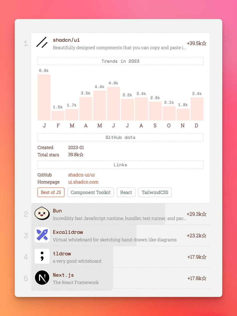 {"data":{"__meta":{"device":false,"path":"/creators/shadcn"},"/creators/shadcn":{"data":{"user":{"id":"31206819","name":"shadcn","description":"building → @vercel - @v0 - https://t.co/HJcOr0AUAr - https://t.co/5Zh4De1NdU","followers_count":104592,"friends_count":202,"statuses_count":4168,"profile_image_url_https":"https://pbs.twimg.com/profile_images/1593304942210478080/TUYae5z7_normal.jpg","screen_name":"shadcn","location":null,"entities":{"url":{"urls":[{"url":"https://t.co/Bhukx0fKUF","expanded_url":"https://shadcn.com","display_url":"shadcn.com","indices":[0,23]}]},"description":{"hashtags":[],"symbols":[],"user_mentions":[],"urls":[{"url":"https://t.co/HJcOr0AUAr","expanded_url":"https://ui.shadcn.com","display_url":"ui.shadcn.com","indices":[27,50]},{"url":"https://t.co/5Zh4De1NdU","expanded_url":"https://dito.so","display_url":"dito.so","indices":[53,76]}]}}},"details":{"type":"The Innovator","description":"A design engineer passionate about creating open-source UI components, shadcn is recognized for their work on charts and contributions to the Next.js community. They are eager to share their creations and inspire others to build upon them.","purpose":"To advance the field of UI design through innovative components that are accessible and customizable for developers worldwide.","beliefs":"Believes in the power of open-source collaboration to drive technological advancement and simplify the development process.","facts":"Fun fact: shadcn joined Vercel as a Design Engineer to further their mission of building customizable UI components for the open-source community.","strength":"Strength lies in their ability to combine design aesthetics with technical functionality, creating user-friendly components that are both beautiful and practical.","weakness":"May sometimes spread themselves too thin by working on a broad range of projects, which could dilute their impact or focus.","roast":"If shadcn's UI components were any more customizable, they'd come with their own settings menu and a side of fries.","win":"Successfully introduced a series of chart components that are widely adopted and appreciated within the developer community.","recommendation":"To grow their audience, shadcn should continue sharing behind-the-scenes looks at their development process and engage with the community through Q&A sessions on the challenges and triumphs of UI/UX design."},"tweets":[{"bookmarked":true,"display_text_range":[0,160],"entities":{"hashtags":[],"media":[{"display_url":"pic.x.com/rwx8hzocsl","expanded_url":"https://twitter.com/shadcn/status/1809352140147900447/photo/1","id_str":"1809346869765795840","indices":[161,184],"media_key":"3_1809346869765795840","media_url_https":"https://pbs.twimg.com/media/GRwXZEfa8AAJLwc.jpg","type":"photo","url":"https://t.co/RWx8HZOCSl","ext_media_availability":{"status":"Available"},"features":{"large":{"faces":[{"x":129,"y":1475,"h":403,"w":403}]},"medium":{"faces":[{"x":76,"y":864,"h":236,"w":236}]},"small":{"faces":[{"x":43,"y":489,"h":134,"w":134}]},"orig":{"faces":[{"x":137,"y":1556,"h":426,"w":426}]}},"sizes":{"large":{"h":2048,"w":2048,"resize":"fit"},"medium":{"h":1200,"w":1200,"resize":"fit"},"small":{"h":680,"w":680,"resize":"fit"},"thumb":{"h":150,"w":150,"resize":"crop"}},"original_info":{"height":2160,"width":2160,"focus_rects":[{"x":0,"y":0,"w":2160,"h":1210},{"x":0,"y":0,"w":2160,"h":2160},{"x":265,"y":0,"w":1895,"h":2160},{"x":1080,"y":0,"w":1080,"h":2160},{"x":0,"y":0,"w":2160,"h":2160}]},"allow_download_status":{"allow_download":true},"media_results":{"result":{"media_key":"3_1809346869765795840"}}}],"symbols":[],"timestamps":[],"urls":[],"user_mentions":[]},"extended_entities":{"media":[{"display_url":"pic.x.com/rwx8hzocsl","expanded_url":"https://twitter.com/shadcn/status/1809352140147900447/photo/1","id_str":"1809346869765795840","indices":[161,184],"media_key":"3_1809346869765795840","media_url_https":"https://pbs.twimg.com/media/GRwXZEfa8AAJLwc.jpg","type":"photo","url":"https://t.co/RWx8HZOCSl","ext_media_availability":{"status":"Available"},"features":{"large":{"faces":[{"x":129,"y":1475,"h":403,"w":403}]},"medium":{"faces":[{"x":76,"y":864,"h":236,"w":236}]},"small":{"faces":[{"x":43,"y":489,"h":134,"w":134}]},"orig":{"faces":[{"x":137,"y":1556,"h":426,"w":426}]}},"sizes":{"large":{"h":2048,"w":2048,"resize":"fit"},"medium":{"h":1200,"w":1200,"resize":"fit"},"small":{"h":680,"w":680,"resize":"fit"},"thumb":{"h":150,"w":150,"resize":"crop"}},"original_info":{"height":2160,"width":2160,"focus_rects":[{"x":0,"y":0,"w":2160,"h":1210},{"x":0,"y":0,"w":2160,"h":2160},{"x":265,"y":0,"w":1895,"h":2160},{"x":1080,"y":0,"w":1080,"h":2160},{"x":0,"y":0,"w":2160,"h":2160}]},"allow_download_status":{"allow_download":true},"media_results":{"result":{"media_key":"3_1809346869765795840"}}}]},"favorited":false,"lang":"en","possibly_sensitive":false,"possibly_sensitive_editable":true,"retweeted":false,"id":"1809352140147900447","view_count":951615,"bookmark_count":5326,"created_at":1720218141000,"favorite_count":12416,"quote_count":286,"reply_count":462,"retweet_count":1174,"user_id_str":"31206819","conversation_id_str":"1809352140147900447","full_text":"Introducing Charts.\n\nA collection of chart components that you can copy and paste into your apps. \n\nBuilt on top of Recharts. Beautifully designed. Open Source. https://t.co/RWx8HZOCSl","in_reply_to_user_id_str":null,"in_reply_to_status_id_str":null,"is_quote_status":0},{"bookmarked":false,"display_text_range":[0,185],"entities":{"hashtags":[],"media":[{"display_url":"pic.x.com/fta2ws9ylc","expanded_url":"https://twitter.com/shadcn/status/1688945578439499776/photo/1","id_str":"1688945445262049280","indices":[186,209],"media_key":"3_1688945445262049280","media_url_https":"https://pbs.twimg.com/media/F3BW7x3bwAATNkj.png","type":"photo","url":"https://t.co/fta2ws9YLc","ext_media_availability":{"status":"Available"},"features":{"large":{"faces":[]},"medium":{"faces":[]},"small":{"faces":[]},"orig":{"fa