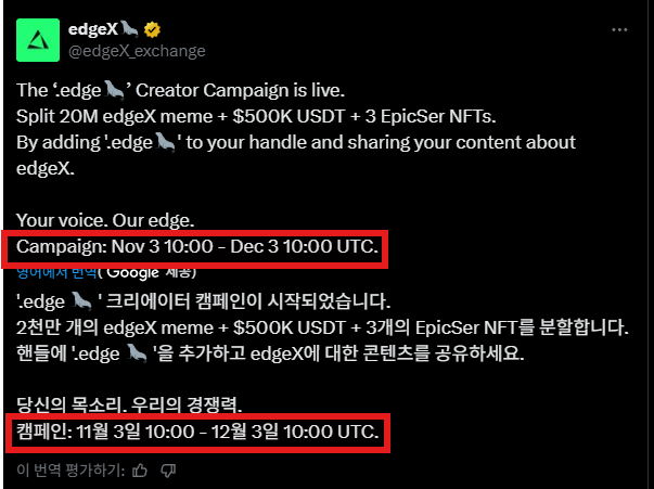 ๊ทธ๋ฅ ๊ผญ ํด๋ผใ ใ ใ ใ ใ ์. @edgeX_exchange '.edge๐ฆญ' ํฌ๋ฆฌ์์ดํฐ ์บ ํ์ธ ์์ ๋ฆฌ์๋ - 2,000๋ง edgeX ๋ฐ์ฝ์ธ - 50๋ง USDT - EpicSer NFT 3๊ฐ ์ฐธ์ฌ๋ฐฉ๋ฒ - ํธ์ํฐ ํธ๋ค์ '.edge๐ฆญ'๋ฅผ ์ถ๊ฐ - edgeX์ ๋ํ ์ฝํ ์ธ ๋ฅผ ๊ณต์ ์บ ํ์ธ ๊ธฐ๊ฐ: 11์ 3์ผ 10:00 ~ 12์ 3์ผ 10:00 (UTC) ๋งค์ค๋จ๊ณผ ์ํธ์์ฉ.... ํด์ผ๊ฒ์ฐ....?