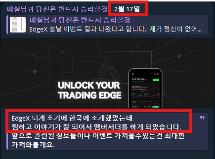 [ edgeX๋ฅผ ์ฒ์์ ์์ํ๊ฒ ๋ ์ด์ A to Z ] : ๊ฝค ์ฌ๋ฐ์๊ฑฐ์...ใ ใ 1. ์ฃ์ง์์ค๋ฅผ ์ฒ์์ ํ๊ฑด ์๋ 12์์ ๋๋ค. ์ด์ ์ง์ง๋ก ๊ฑฐ์ 1๋ ์ด ๋ค ๋ ์์ ์ธ๋ฐ. 2. ๊ทธ๋ ๋น์์ ํ์ดํผ๋ฆฌํด๋์ ํฌ๋ชจ๊ฐ ๋๋ฌด ์ฌํ์ด์. ๊ทธ๋์ ํธ์ํฐ์์ ์ 2์ ํ์ดํผ๋ฆฌํด๋๋ผ๊ณ ๋ถ๋ฆฌ๋ ์ ๋ค์ ์ฐพ์ผ๋ฌ ๋ค๋ ์ต๋๋ค. 3. ๊ทธ๋ฌ๋ค๊ฐ ์ฐพ์๊ฒ @edgeX_exchange . ๋น์ฐํ ๋ง๋ก 4. ์ 2์ ํ์ดํผ๋ฆฌํด๋ << 100% ๊ตฌ๋ผ์ ๋๋ค. ๊ทธ๋ฐ๊ฒ ์์๋ฆฌ๊ฐ ์์์์.... ๊ทธ๋๋ ํ๋ฒ ์จ๋ณด์ ์ถ์ด์ ๋ค์ด๊ฐ๋๋ฐ 5. ๋ชจ๋ฐ์ผ ์ดํ์ด ์๋ค๊ณ ํ๋๋ผ๊ณ ์? ๊ทธ๋์ ๋ฐ๋ก ์ค์นํด๋ดค์ต๋๋ค. 6. ์ ๊ทผ๋ฐ ์ด๊ฒ ๋ญ์ง. ๋ถ๋ช ๊ทน์ด๊ธฐ ํ๋ก์ ํธ๋ผ๊ณ ์๊ณ ์๋๋ฐ ์ดํ ํ๋ฆฌํฐ๊ฐ ๋๋ฌด ์ข๋๋ผ๊ณ ์. ์ง์ง๋ก ๋ฐ์ด๋น , OKX ์ฐ๋๊ฑฐ๋ ์ฐจ์ด๊ฐ ์๋ฌ์ด์. ๊ทธ๋์ ์ด๋ ์ด์ง ๋๋๊ณ ์๋ค๊ฐ ์ง์ง ๋ญํ๋ ์ ๋ค์ธ์ง , ์ค์บ ์ธ์ง ์๋์ง ์ดํด๋ดค์ต๋๋ค. 7. ์ ๊ฐ ๋ด๋ฆฐ ๊ฒฐ๋ก ์ ์ค์บ ์ ์๋๊ฑฐ ๊ฐ๋ค. ์ฐ๋ฒ๊ทธ๋ฃน์ด ์ธํ๋ฒ ์ดํ ์ ํด์ฃผ๊ณ ์๋ค๊ณ ํ๊ณ ์ดํ ํ๋ฆฌํฐ๋ ๊ฝค๋ ์ค์ํ๋ค. ์ฌ์ง์ด ๊ทน์ด๊ธฐ๋ผ๊ณ ? OK ๋ ์ข ๋ น์ฌ๋ณด์. - ๋ฑ ์ด ๋ง์ธ๋๋ก ์์ 8. ๊ทธ๋ฐ๋ฐ..................... ๋์ ์ ๊ธ์ ํ๋๋ฐ ์ค๋ฅ๊ฐ ๋๊ฑฐ์์. ๊ทธ๋ ์๋ง ํ 4์ฒ๋ถ์ธ๊ฐ 5์ฒ๋ถ์ ๋ฃ์๋๋ฐ ์ ๊ธ ๋ฐ์ ๋ฐ์์ด ์๋๋๊ฑฐ์.... ๊ทธ๋์ ์ ์ญ์ ํ๊ผฌ ํ๋ก์ ํธ...์์ค!!! ์ด๋ฌ๋ฉด์ ๋์ค์ฝ๋์ ์ณ๋ค์ด๊ฐ์ต๋๋ค 9. ๋ฐ๋ก ํฐ์ผ์ ์ด๊ณ . ๋ด๋ ๋๋ ค๋ฌ๋ผ๊ณ ์ง์ง๋์ต๋๋ค. ์์ ์ธ์์ด์. 10. ๊ทธ๋ฐ๋ฐ ๋ช๋ถ ์ง๋์ง์์์ ๋ด๋น์๊ฐ ๋์๊ณ ์ฒดํฌํด์ค๋ค๊ณ ํด์ ๊ธฐ๋ค๋ ธ๋๋ edgeX ๋ชจ๋ฐ์ผ ์ดํ์ ๋์ด ๋ค์ด์์๋๋ผ๊ตฌ์. ํํ.... ์ด๋๋ถํฐ ์ด์ ์ฃ์ง์์ค์์ ์ธ์ฐ์ด ์์๋์์ต๋๋ค. 11. ๊ทธ ํ๋ก ๋ ๋ น์ด๊ณ ์ฐ๊ณ ์ด์ฉ๊ตฌ ์ ์ฉ๊ตฌ. ์๊ฐ์ด ์ข ์ง๋ฌ๋๋ฐ ์ด๋๋ edgeX ํ์๊ฒ์ ์ฐ๋ฝ์ด ์์ด์. ์ง์ง๋ก ํ ๋ ๊ทธ๋จ์ ํตํด์ ์ฐ๋ฝ์ด ์์๋ค์. 2์์ธ๊ฐ? ์ ๊ธฐ์ต๋ ์๋๋ค์. ์ฐพ์๋ณด๋ ์ง์ง๋ก 2์์ ์ฐ๋ฝ์ด ์์๋ค์ ใ ใ ๊ทธ๋ ์ฐ๋ฝ์ด ์์ ํ์๋ถ์ด ๊ทธ๋ฌ์ด์. "ํ๊ตญ์ ๋๊ฐ ์ฒ์์ผ๋ก ์๊ฐ๋ฅผ ํด์คฌ๋ค." ๊ทธ๋์ ํ๊ตญ ์ ์ ์ด ์ข ์๊ฒผ๋ค. ๊ณ ๋ง๋ค. ์ฐ๋ฒ์๋ํ๋ฉด์ ๊ฐ์ด ๊ฐ๋ฉด ์ข์๊ฑฐ๊ฐ๋ค - ๋ผ๊ณ ์ฐ๋ฝ์ด ์์ต๋๋ค. (์ง์ง๋ก ๊ทธ๋ฌ์) 12. ๊ทธ๋์ ์ ๋ฒ์๋๋ฅผ ์งํํ๊ฒ ๋์๊ณ ์๋ง ์ด๊ฒ ์ ๊ฐ ๊ณต์์ ์ผ๋ก ํ ์ฒซ๋ฒ์งธ ์ ๋ฒ์๋์ธ๊ฒ ๊ฐ์ต๋๋ค. ๊ทธ๋์ ๊ทธ๋ ์ดํ๋ก๋ ํธ์ํฐ์ ์ ๋ ๋ฐ์ ๋ฅผ ํ๋๋ฌ์ฃ . ์ด๋ ๊ฒ edgeX ์ ๋ฒ์๋๋ผ๊ณ ์ ์ด๋์์ง ์ด์ ๋ช๋ฌ์ด ์ง๋ฌ๋ค์. 13. ๊ฒฐ๊ณผ์ ์ผ๋ก "์ด์ด ์ข๊ฒ" ์ข์ ํ๋ก์ ํธ๋ฅผ ์ฐพ์๊ณ "์ด์ด ์ข๊ฒ" ์ดํ์ ์ฌ์ฉํ์๊ณ "์ด์ด ์ข๊ฒ" ์ด๊ธฐ์ ์ํธ์์ฉ์ ํ์๊ณ "์ด์ด ์ข๊ฒ" ํ์๋ค ์ฐ๊ณ "์ด์ด ์ข๊ฒ" ํ๋ก์ ํธ๊ฐ ์คํ ์ ์ ํ๊ณ ๊ทธ๋ฆฌ๊ณ .... "์ด์ด ์ข๊ฒ" ์ฌ๊ธฐ๊น์ง ์์ต๋๋ค. ์์ผ๋ก๋ "์ด์ด ์ข๊ฒ" ๋ฌด์ธ๊ฐ๊ฐ ์ผ์ด๋ ์ง๋ ๋ชจ๋ฅด๊ฒ ์ต๋๋ค. ์ ๋ง ๋ชจ๋ฅด๊ฒ ์ด์. ๋ช๋ฌ๋ค์๋ ์๋์ ๊ฐ์ ๋ง์ด ์์ ๋ ์ ํ์ผ๋ฉด ์ข๊ฒ ์ต๋๋ค. "์ด์ด ์ข๊ฒ" TGE๊ฐ ์ฑ๊ณต์ ํ๊ณ "์ด์ด ์ข๊ฒ" ๋๋ ํ์ง์์๊ณ - "์ด์ด ์ข๊ฒ" ์ด ๊ธ์ ์ ๊ณ ์๋ค