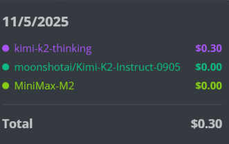 For finding bugs, Roo Code + GLM 4.6 thinking beats both Minimax m2 AND the latest Kimi K2 Thinking. I have stopped using Kilo Code now after this, although it is suppose to be a fork of Roo which is a fork of Cline; there is some issue with tool calling on Kilo Code (windows). Kimi K2 Thinking fix attempt (fail): Cost $0.13 , time: 1 min 38 sec GLM 4.6 fix code: (success with try again prompt) Cost $0.23 , time: 1 min 6 sec But of course that's just what it would cost if you pay from official sites. These models are INCLUDED with the subscription. I have scoured far and wide for the best AI deals and @NanoGPTcom is still the best. 8$ a month for 2000 uses a day is insane (can be unlocked to 60,000 a day but that's the monthly limit); some competitors are like 2000 a week and some even 20 a week (*cough new Codex usage changes). If a single bug fix averages 15 cents, and you max it out at 2k a day, that's like 300$ a day saved, and if you only use it like a normal dev and only do 200 a day that's still like 30$ a day savings. I only saved 10$ today because I was mostly using kimi to try and fix stuff but it kept failing. It's great for refactoring large code to make them more modular, but GLM 4.6 is still king in my eyes for bug fixing... for now! I asked ChatGPT Codex like 5 questions and it's already out of commission for a week with 16% usage left AND doesn't even fix my shit, yet cost 20$ a month. I'm 2 weeks into using this thing and I feel like I fell for the trap; I'm addicted to using it as if I'm actually making money the more I use it and there is no fear of asking the wrong questions, which may cause you to end up using a few bucks for a single FAILED query on pay per use plans. This 8$ allows you to figure out which model works best for you, and new models are added FAST. I can't stress how much of a steal it is and if I was a competitor and wanna do evil I would sign up for a ton of 8$ accounts and try to break the company by maxing/spamming/abusing the limits. @grok I'm sure companies are already doing this in the AI space, you know, like API abuse/sabotage; do you know of any instances of this that people has talked about? And lastly, shameless shill of my referral code for anyone to use to get 5% forever discount on paid only models. (I don't think it applies to the 8$ subscription fee though). I wished someone gave me 5% forever discount to use other paid models! nano-gpt.com/invite/KaWMKneR