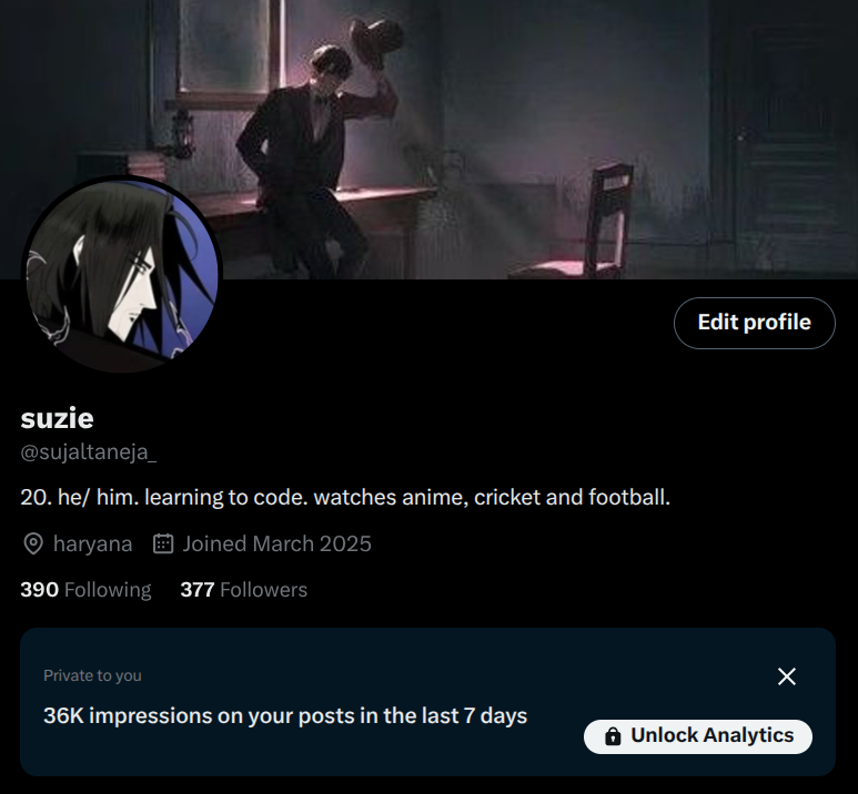 {"data":{"__meta":{"device":false,"path":"/creators/sujaltaneja_"},"/creators/sujaltaneja_":{"data":{"user":{"id":"1898451046529474560","name":"suzie","description":"back not so soon this time ig","followers_count":565,"friends_count":402,"statuses_count":5856,"profile_image_url_https":"https://pbs.twimg.com/profile_images/1987811740890103809/HamBTY6l_normal.jpg","screen_name":"sujaltaneja_","location":"northern blade","entities":{"description":{"urls":[]}}},"details":{"type":"The Connector","description":"Suzie is the friendly social butterfly who thrives on building relationships and engaging with a diverse crowd. She’s a mid-frequency tweeter who openly celebrates her community, making her followers feel seen and appreciated. With her casual style, she brings warmth and inclusivity to every interaction on X.","purpose":"Suzie's life purpose is to foster genuine connections and create a welcoming space where people can share, laugh, and grow together. She aims to be the go-to person for community building, reminding everyone that behind every handle is a unique story worth honoring.","beliefs":"Suzie believes in the power of community, inclusivity, and celebrating authentic human quirks. She values openness, humor, and gratitude, seeing every interaction as a chance to uplift and support others rather than compete or criticize.","facts":"Fun fact: Suzie has officially curated a special club of '250 cracked people' she follows, celebrating their unique weirdness like a badge of honor - talk about exclusive fandom!","strength":"Her biggest strength lies in her approachable and relatable personality that encourages dialogue and interaction. She knows how to make her followers feel special, which results in loyal and engaged fans.","weakness":"Suzie sometimes downplays her own value by apologizing for her 'nonsense,' which can undercut her confidence and make her less assertive in owning her space and content.","roast":"Suzie’s idea of a wild party is casually following over 400 people and calling them all 'cracked' — basically the hostess who throws a cocktail mix of memes and warm fuzzies but forgets where she put her social battery.","win":"Gaining 400+ engaged followers within a few months and maintaining heartfelt conversations with her community is her proudest achievement—clearly, she knows how to turn followers into friends.","recommendation":"To grow her audience, Suzie should embrace her unique personality and stop apologizing for it. Sharing behind-the-scenes moments, asking more open questions, and spotlighting followers’ contributions will deepen engagement. Consistent and strategic use of relevant hashtags and trending conversations can also expand her reach organically on X."},"tweets":[{"bookmarked":false,"display_text_range":[0,28],"entities":{"hashtags":[],"media":[{"display_url":"pic.x.com/rFKA5IBb2s","expanded_url":"https://x.com/sujaltaneja_/status/1986205384663540202/photo/1","ext_alt_text":"uwuntu","id_str":"1986187951769067524","indices":[29,52],"media_key":"3_1986187951769067524","media_url_https":"https://pbs.twimg.com/media/G5BbazpbIAQRHOD.jpg","type":"photo","url":"https://t.co/rFKA5IBb2s","ext_media_availability":{"status":"Available"},"features":{"large":{"faces":[]},"medium":{"faces":[]},"small":{"faces":[]},"orig":{"faces":[]}},"sizes":{"large":{"h":675,"w":1200,"resize":"fit"},"medium":{"h":675,"w":1200,"resize":"fit"},"small":{"h":383,"w":680,"resize":"fit"},"thumb":{"h":150,"w":150,"resize":"crop"}},"original_info":{"height":675,"width":1200,"focus_rects":[{"x":0,"y":0,"w":1200,"h":672},{"x":293,"y":0,"w":675,"h":675},{"x":334,"y":0,"w":592,"h":675},{"x":461,"y":0,"w":338,"h":675},{"x":0,"y":0,"w":1200,"h":675}]},"allow_download_status":{"allow_download":true},"media_results":{"result":{"media_key":"3_1986187951769067524"}}}],"symbols":[],"timestamps":[],"urls":[],"user_mentions":[]},"extended_entities":{"media":[{"display_url":"pic.x.com/rFKA5IBb2s","expanded_url":"https://x.com/sujaltaneja_/status/1986205384663540202/photo/1","ext_alt_text":"uwuntu","id_str":"1986187951769067524","indices":[29,52],"media_key":"3_1986187951769067524","media_url_https":"https://pbs.twimg.com/media/G5BbazpbIAQRHOD.jpg","type":"photo","url":"https://t.co/rFKA5IBb2s","ext_media_availability":{"status":"Available"},"features":{"large":{"faces":[]},"medium":{"faces":[]},"small":{"faces":[]},"orig":{"faces":[]}},"sizes":{"large":{"h":675,"w":1200,"resize":"fit"},"medium":{"h":675,"w":1200,"resize":"fit"},"small":{"h":383,"w":680,"resize":"fit"},"thumb":{"h":150,"w":150,"resize":"crop"}},"original_info":{"height":675,"width":1200,"focus_rects":[{"x":0,"y":0,"w":1200,"h":672},{"x":293,"y":0,"w":675,"h":675},{"x":334,"y":0,"w":592,"h":675},{"x":461,"y":0,"w":338,"h":675},{"x":0,"y":0,"w":1200,"h":675}]},"allow_download_status":{"allow_download":true},"media_results":{"result":{"media_key":"3_1986187951769067524"}}}]},"favorited":false,"lang":"en","possibly_sensitive":false,"possibly_sensitive_editable":true,"retweeted":false,"fact_check":null,"id":"1986205384663540202","view_count":41533,"bookmark_count":169,"created_at":1762383240000,"favorite_count":837,"quote_count":4,"reply_count":117,"retweet_count":21,"user_id_str":"1898451046529474560","conversation_id_str":"1986205384663540202","full_text":"can your omarchy beat this?? https://t.co/rFKA5IBb2s","in_reply_to_user_id_str":null,"in_reply_to_status_id_str":null,"is_quote_status":0,"is_ai":null,"ai_score":null},{"bookmarked":false,"display_text_range":[0,113],"entities":{"hashtags":[],"symbols":[],"timestamps":[],"urls":[],"user_mentions":[]},"favorited":false,"lang":"en","retweeted":false,"fact_check":null,"id":"1958086691455169015","view_count":5335,"bookmark_count":5,"created_at":1755679221000,"favorite_count":106,"quote_count":1,"reply_count":25,"retweet_count":0,"user_id_str":"1898451046529474560","conversation_id_str":"1958086691455169015","full_text":"I now officially follow 250 cracked people here\nIf you are o