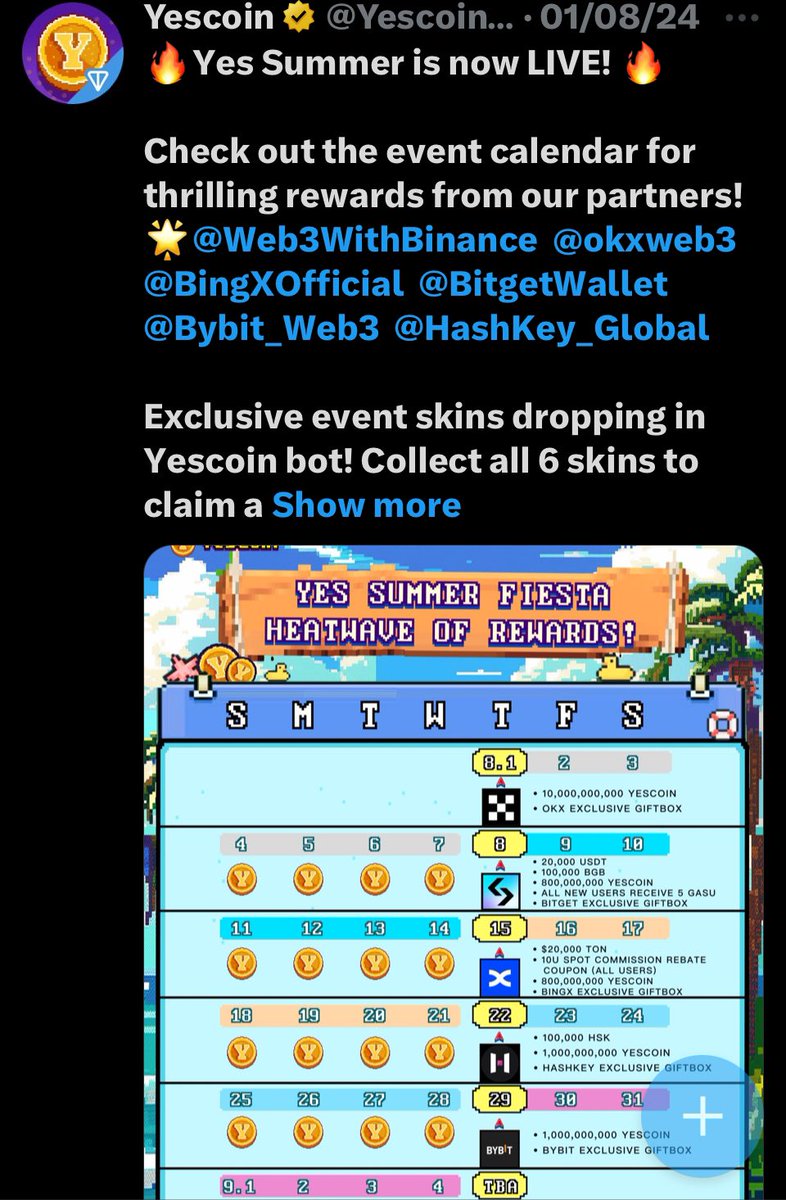 Celebrate 1 Million Users with $5,000 Giveaway!🎉 Join us in celebrating a major milestone! We're giving away $5,000 split among 50 lucky winners. How to Enter: 1. Follow @the_yescoin on X. 2. Subscribe to our channel: t.me/therealyescoin 3. Actively play our app: t.me/yescoingame_bot 4. Tag 3 at least friends. more tags, more chances to win! 📅 Draw Date: June 15. Don’t miss out! Good luck everyone.