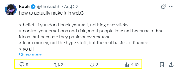 ⚡️ Growth audience tips To grow their audience on X, Kuch should capitalize on threading educational content with humor while pacing their tweets for maximum clarity. Engaging directly with followers through polls, AMAs, and targeted niche communities will deepen trust. Incorporating occasional long-form analysis or video explainers could also broaden their appeal beyond hardcore memecoin hunters.