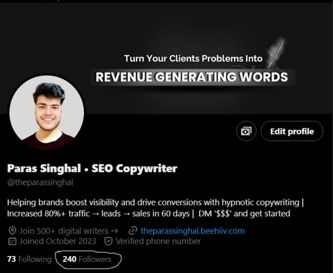 To grow his audience on X, Paras should lean into storytelling that highlights lessons learned from setbacks and celebrate small wins in a relatable way. Engaging in live Q&A sessions and sharing behind-the-scenes insights on how he crafts copy can build stronger community ties and boost interaction.