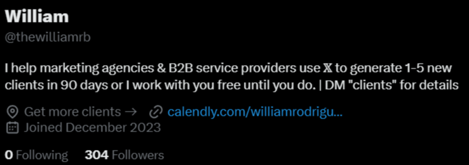 To grow his audience on X, William should continue showcasing client success stories and behind-the-scenes glimpses of his lead-gen strategy. Adding more interactive content like polls or Q&A threads could deepen engagement and convert curious followers into loyal clients.
