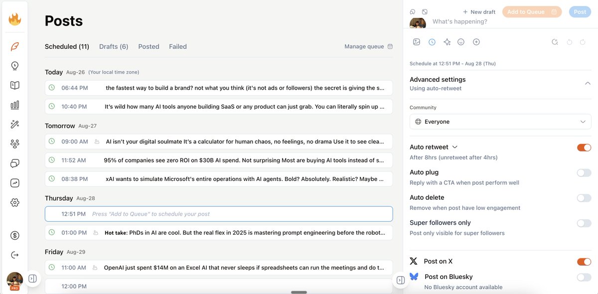 Within 30 mins I got 12 posts scheduled, I can see the effort put behind the product to make good quality tweets, not just AI slop
