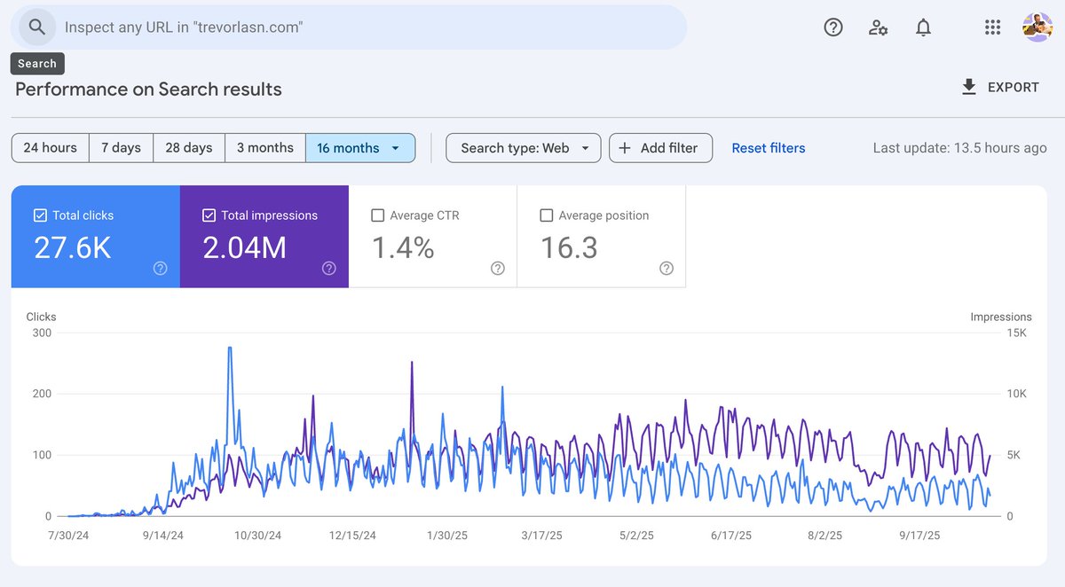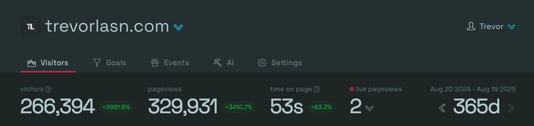 Fun fact: Trevor’s programming blog has amassed over 2 million organic impressions and almost 28,000 clicks—all achieved without spending a single dollar on advertising.