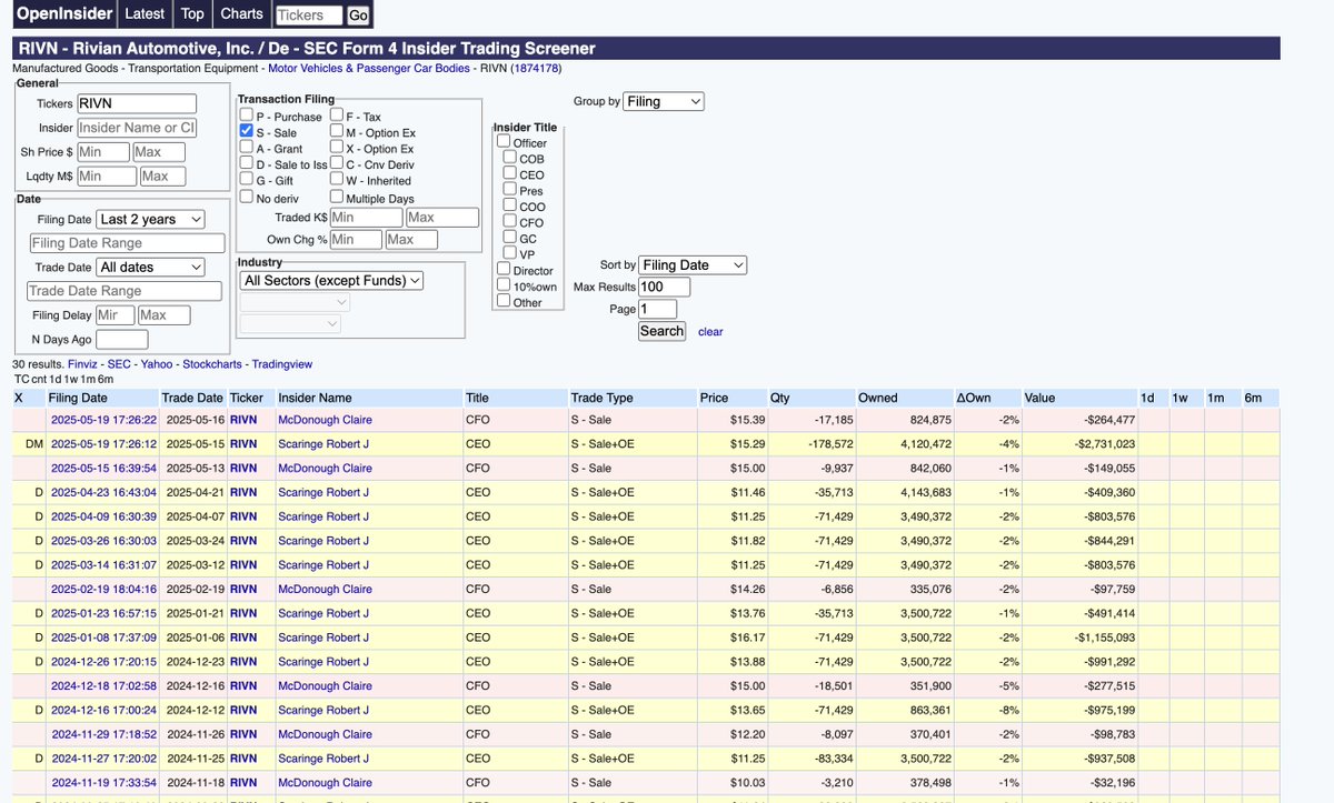 opensider.com its pretty neat.. I just discovered it. Looking at $rivn and no insider buys the past 2 years.. only sells and still active selling even down here 🤒