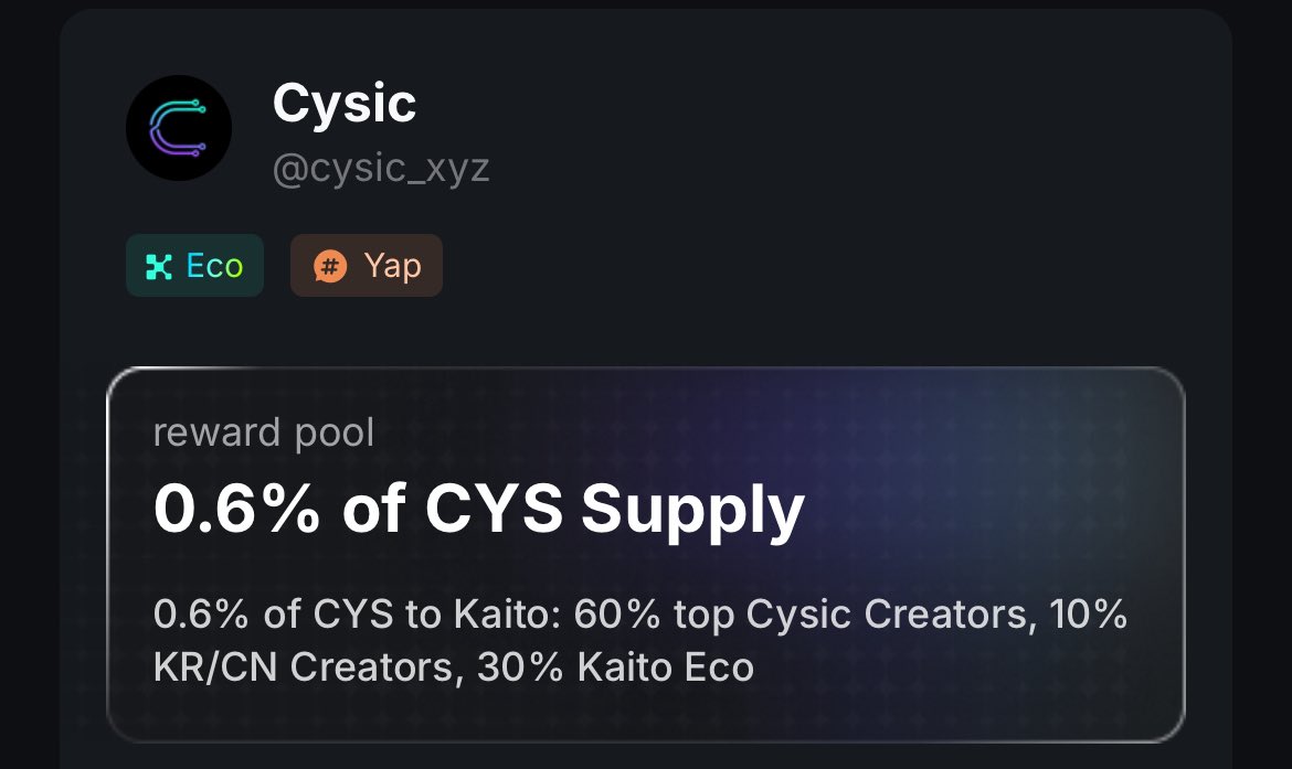 They’ve allocated 0.6% of the total $CYS supply to Kaito ( 60% goes to top creators on x, 10% to Korean and Chinese creators, and 30% to kaito eco)