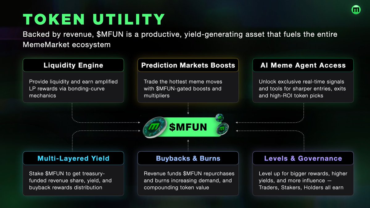 $MFUN rewards, burns, compounds, and governs a DeFi utility stack disguised as a meme. Public sale incoming! $MFUN The Heart of MemeMarket $MFUN is a revenue backed asset at the core of the MemeMarket ecosystem, designed to generate sustainable value. It rewards both traders and investors while compressing supply, encouraging participation, and supporting long term growth. Liquidity Engine Provide liquidity and earn layered, amplified rewards through bonding curve mechanics. Deepen the market while boosting your own gains. Prediction Market Boosts Gain an edge in meme coin moves. Unlock $MFUN gated boosts and multipliers to maximize your returns. AI Meme Agent Access Access exclusive signals and intelligent tools to capture the hottest market moments. Gain sharper entries, exits, and high ROI picks. Multi Layered Yield Stake $MFUN to benefit from treasury-backed revenue sharing, yields, and buyback rewards. Buybacks & Burns Revenue is used for $MFUN repurchases and burns, continually reducing supply. This increases demand and compounds token value over time. Levels & Governance Higher levels mean bigger rewards. Whether you’re a trader, staker, or holder, you earn more yield and greater influence. Economically Aligned Governance $MFUN is more than a token it’s a decision making power. The depth of your commitment determines your governance weight, aligning long term value with tokenholder participation. More Details: X: @MemeMarketFun Website: mememarket.fun