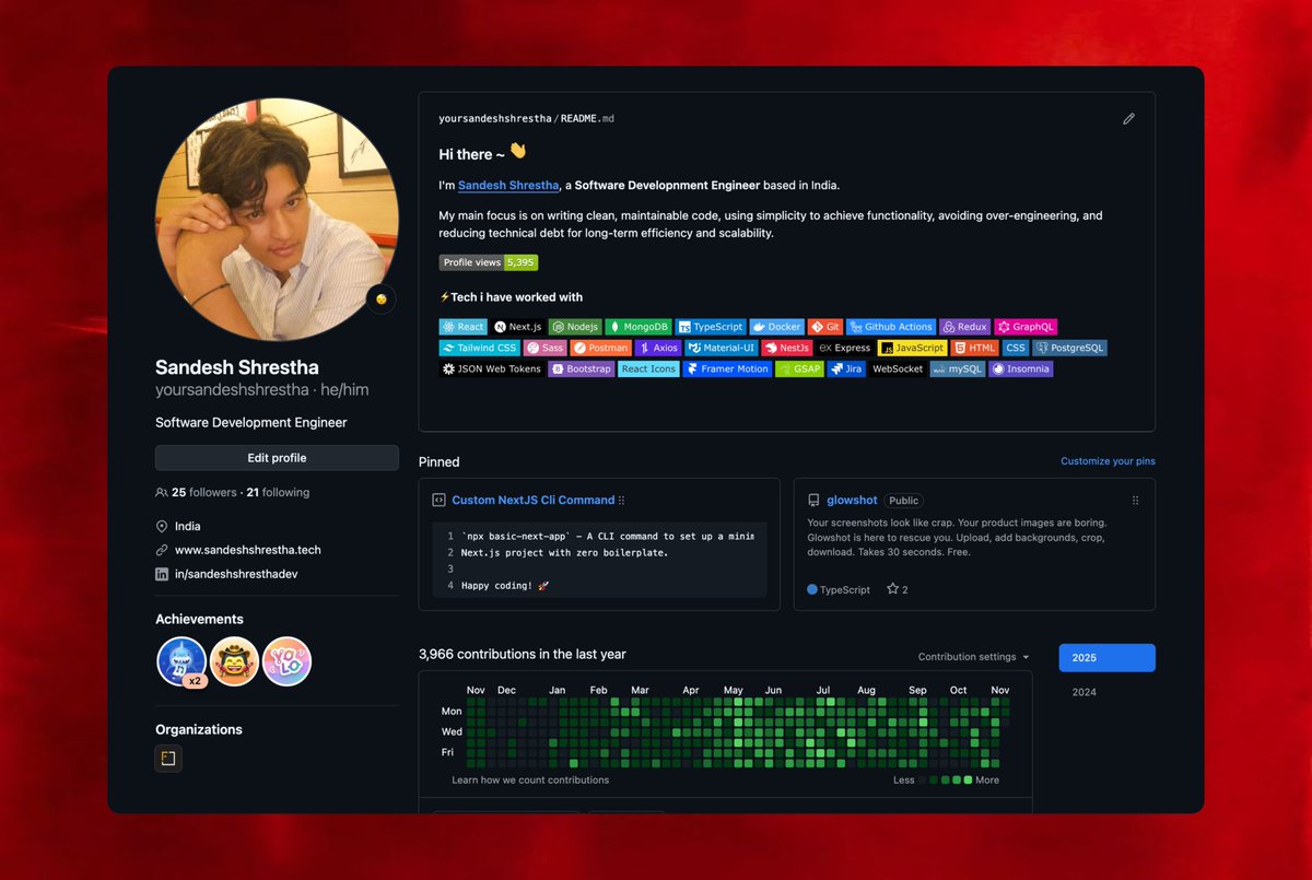 Sandesh Shrestha is a driven and reliable developer carving his career path with impressive rapid growth and consistent sharing of valuable tech resources. At just 21, his hustle in freelancing and securing multiple offers showcases his impressive ambition and capability. His narrative is one of persistence, learning, and celebrating wins with the community.
