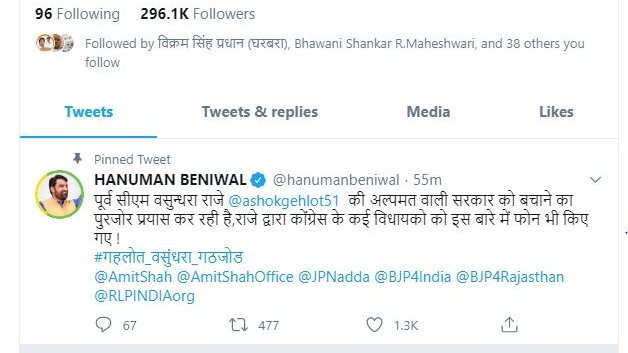 ट्वीट करके लगाए आरोप, #गहलोत_वसुंधरा_गठजोड़ हैशटैग से कर रहे ट्वीट,राजे पर गहलोत सरकार को मदद करने के लगाए आरोप