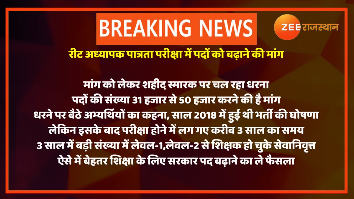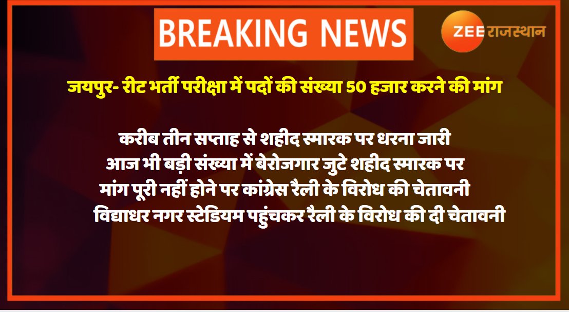 पदों की संख्या 31 हजार से 50 हजार करने की मांग,पिछले 15 दिनों से शहीद स्मारक पर चल रहा धरना,धरने पर बैठे अभ्यर्थियों की मांग, 3 साल पहले रीट अध्यापक पात्रता परीक्षा की हुई थी घोषणा...