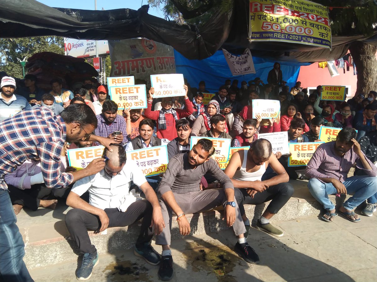मांग को लेकर बेरोजगार अपना रहे अनूठे तरीके, आज बेरोजगारों ने मुंडन करवाकर जताया अपना विरोध, शहीद स्मारक पर धरने पर बैठे बेरोजगारों ने करवाया मुंडन, पदों की संख्या 31 हजार से बढ़ाकर 50 हजार करने की मांग