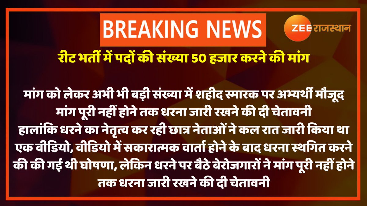 #Jaipur: रीट भर्ती में पदों की संख्या 50 हजार करने की मांग को लेकर शहीद स्मारक पर धरना जारी, धरने पर बैठे बेरोजगारों ने दी आमरण अनशन की चेतावनी,आज शाम से सभी बेरोजगारों ने अनशन की दी चेतावनी, पिछले करीब दो महीनों से धरने पर बैठे हैं बेरोजगार