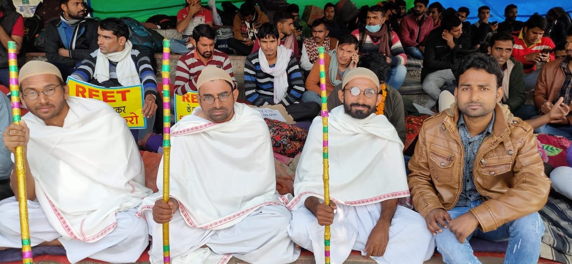 मांग को लेकर आज शहीद स्मारक पर अनूठा प्रदर्शन,धरने पर बैठे बेरोजगारों ने गांधीवादी तरीके से किया प्रदर्शन,3अभ्यर्थियों द्वारा गांधीजी का वेश धारण कर की गई मांग,पदों की संख्या 31 हजार से बढ़ाकर 50 हजार करवाने की मांग