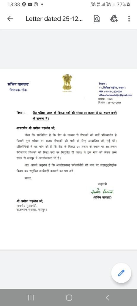 अभ्यर्थियों की मांग का समर्थन करते हए पायलट ने CM @ashokgehlot51 को लिखा खत, 50 हजार अभ्यर्थियों को नियुक्ति का दिया सुझाव