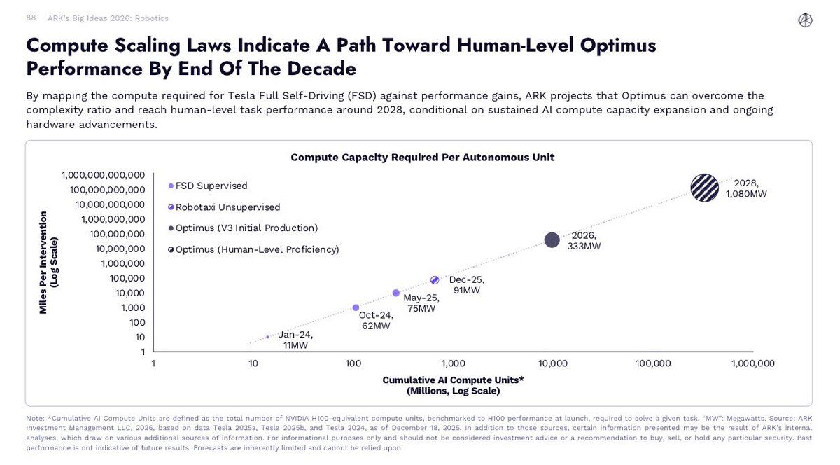 CATHIE WOOD CALLS OPTIMUS HUMAN-LEVEL BY 2028 ON 1GW COMPUTE SURGE ARK Invest's 2026 robotics deep dive just laid out a bold timeline: Tesla Optimus reaching human-level task proficiency around 2028, riding a sustained AI compute explosion to 1.08 gigawatts....