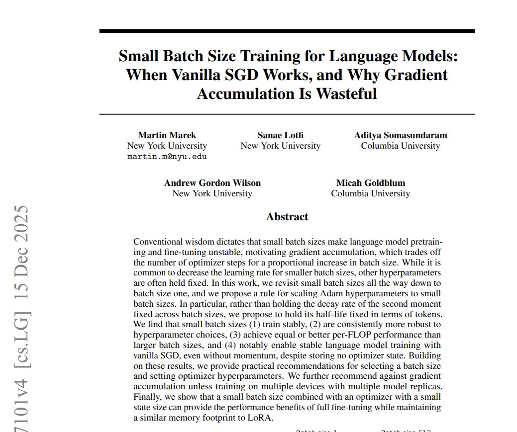 This paper shows LLM training can stay stable at batch size 1, if Adam is set right. They tune Adam by token count, so batch size 1 can train an LLM stably. That cuts memory use and tuning work, and it makes full fine-tuning more realistic on 1 GPU....